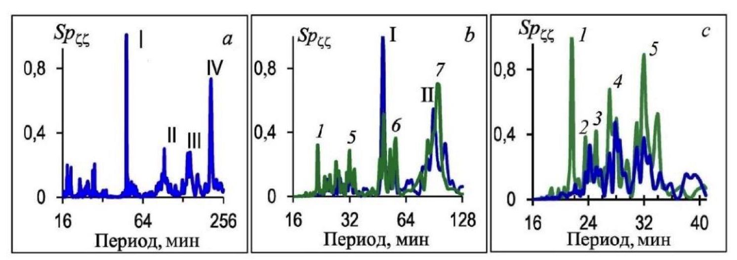 Рассмотрим приведенные на рис. 4, b, c спектры, полученные в 2001 г. по двум последовательным 7-суточным реализациям. В диапазоне периодов 16–128 мин цифрами 1, 2, …, 7 пронумерованы соответствующие максимумы. Приведем значения периодов, на которых эти максимумы располагаются: