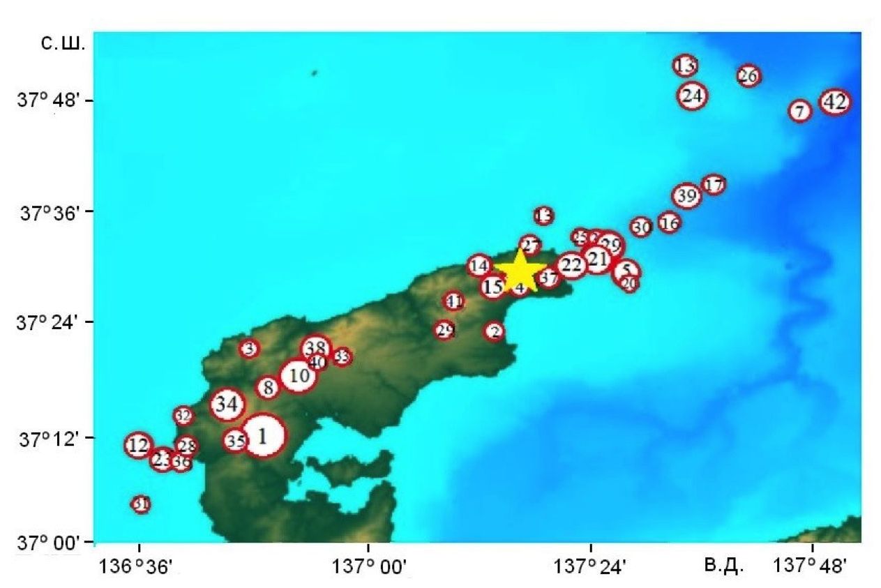 F i g. 2. Aftershocks after the 01/01/2024 earthquake on the Noto Peninsula (yellow star is the earthquake epicenter; circles with numerals indicate the order of aftershocks 5)