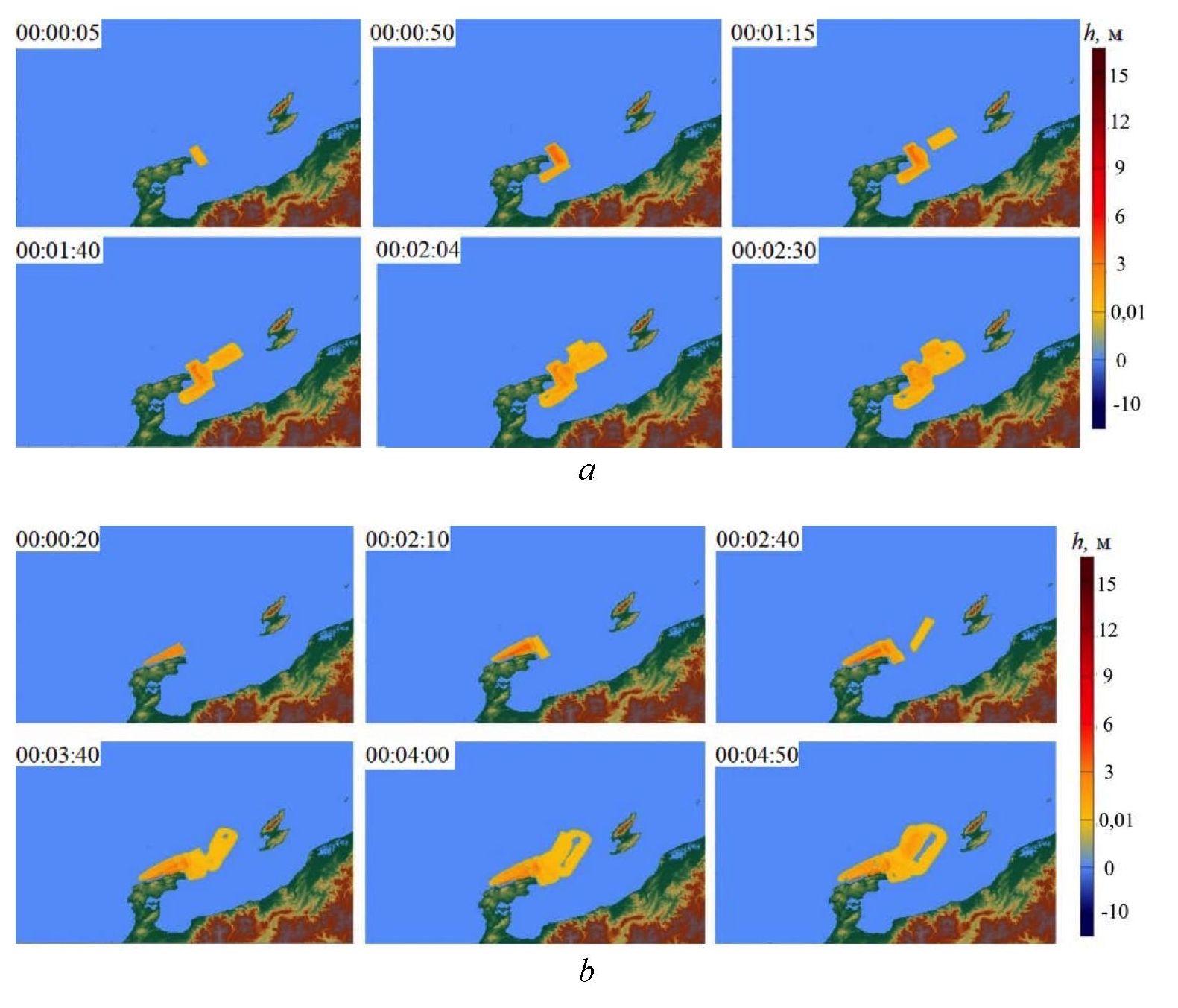 F i g. 5. Generation of a tsunami source at six time points in scenarios 1 (a) and 4 (b)