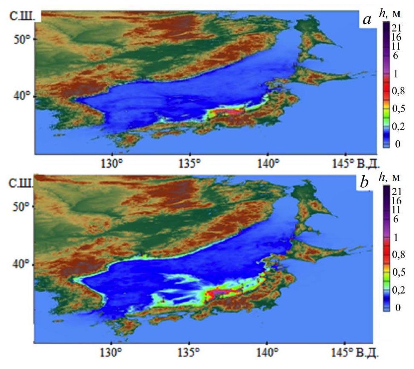 По распределению высот на рис. 7 видно, что имеет место хорошее согласие с рис. 1, где наиболее опасной областью являются побережья, расположенные в северо-восточной части п-ова Ното, а также города Тояма, Садо и Кашивазаки. Расчет проводится до 5-метровой изобаты.
