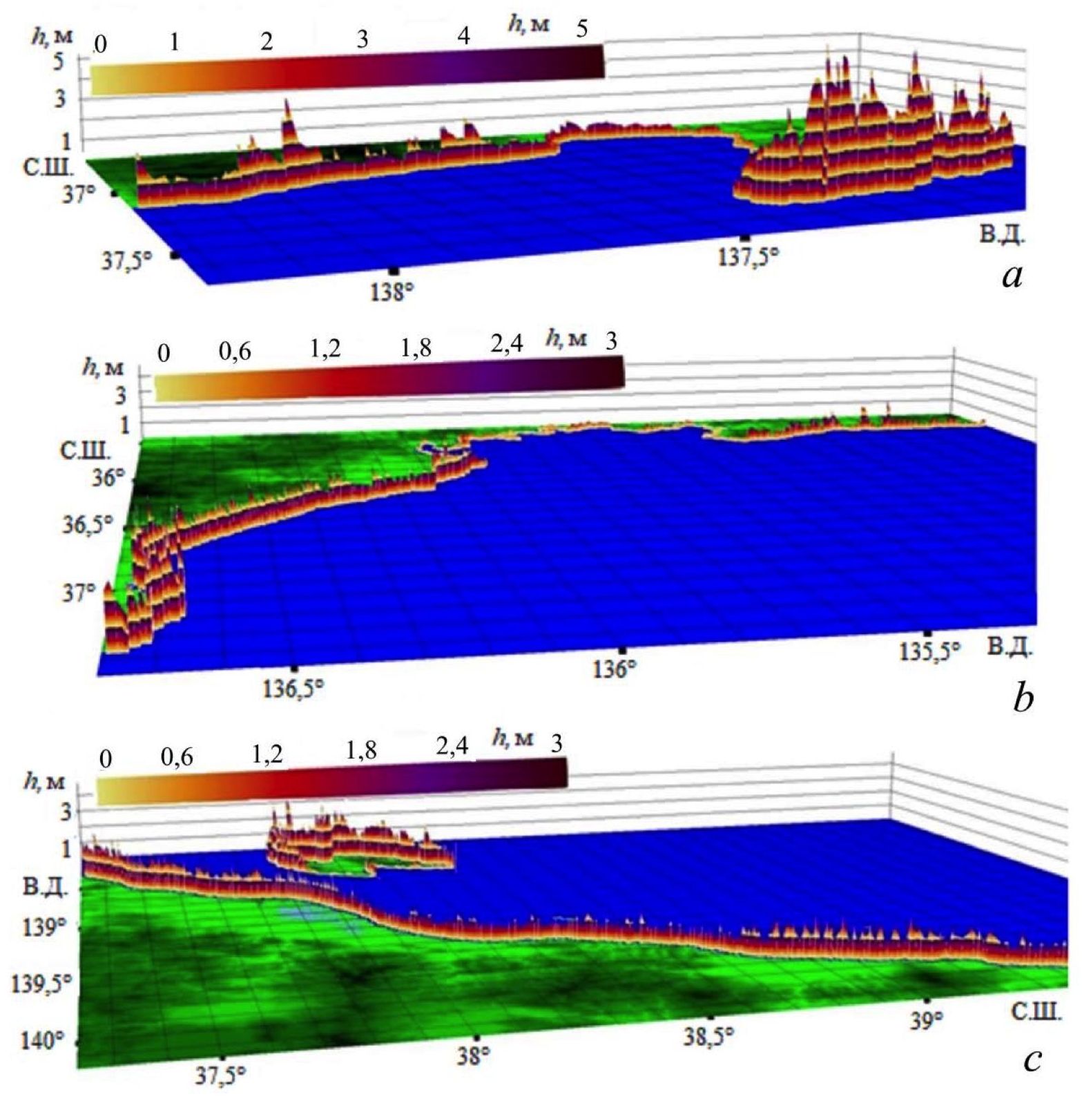 Р и с. 8. 3D-гистограммы высоты волн: а – зал. Тояма; b – район Чюба и Кансай; с – район Тохоку и о. Садо (синий цвет – море, зеленый – суша)
