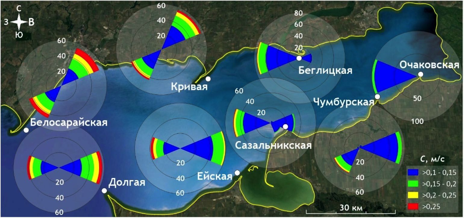 Степень развития ветрового волнения зависит от множества факторов: силы, устойчивости по направлению и времени действия ветрового потока, длины разгона, батиметрических особенностей. В нашем случае наиболее сильное ветровое волнение проявляется на входе в Таганрогский залив, а также в районе косы Беглицкой (рис. 4).