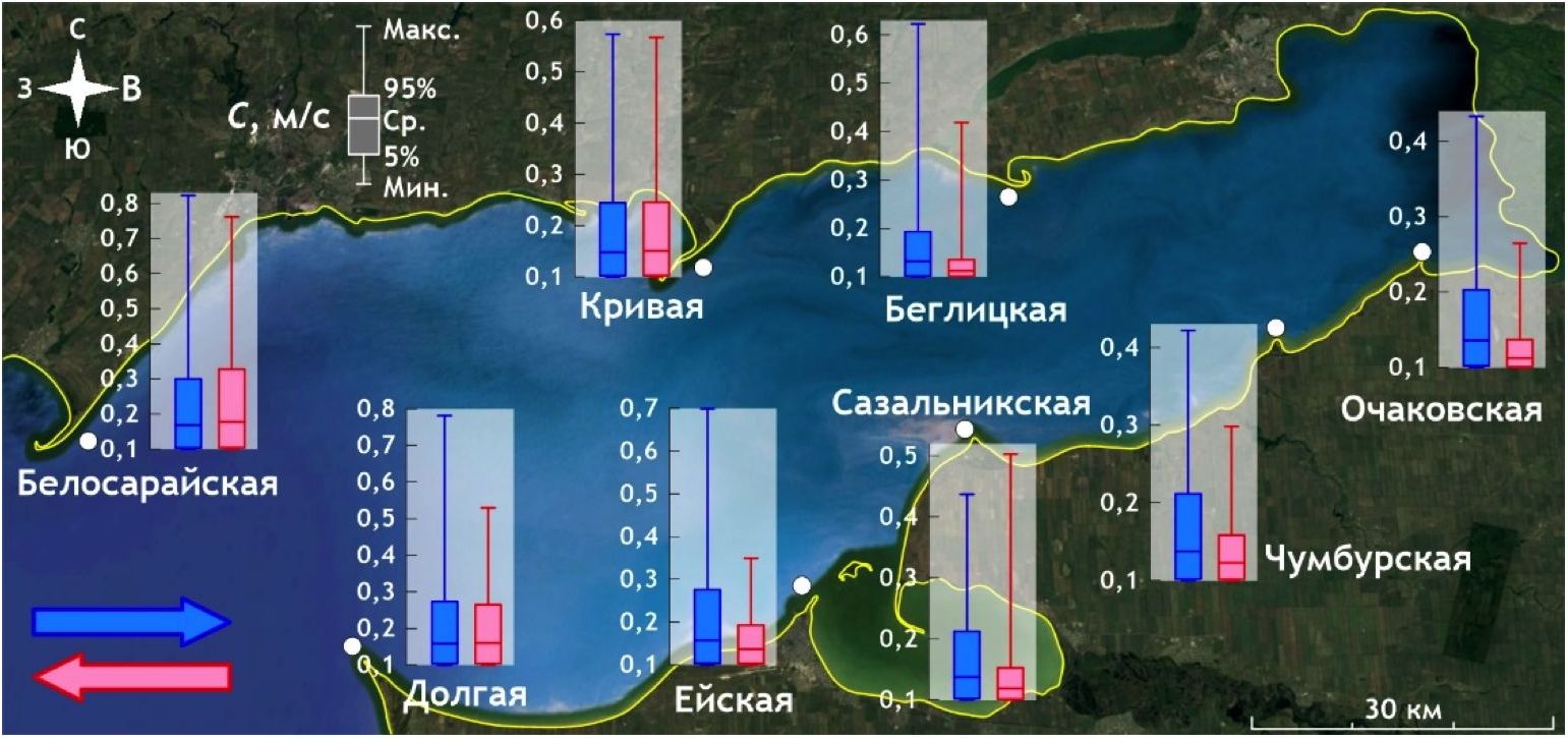 - В прибрежных водах Белосарайской и Кривой кос (северное побережье) среднемноголетние значения скоростей течений восточных потоков незначительно превосходят скорости течений западных направлений. В районе косы северного побережья Беглицкой, а также кос Очаковской, Чумбурской, Сазальникской и Ейской южной части залива заметно доминирование течений с запада, причем как по средним скоростям, так и по максимальным. При этом небольшое исключение составляет режим вод у Сазальникской косы, где наибольшие скорости развиваются при восточных течениях.