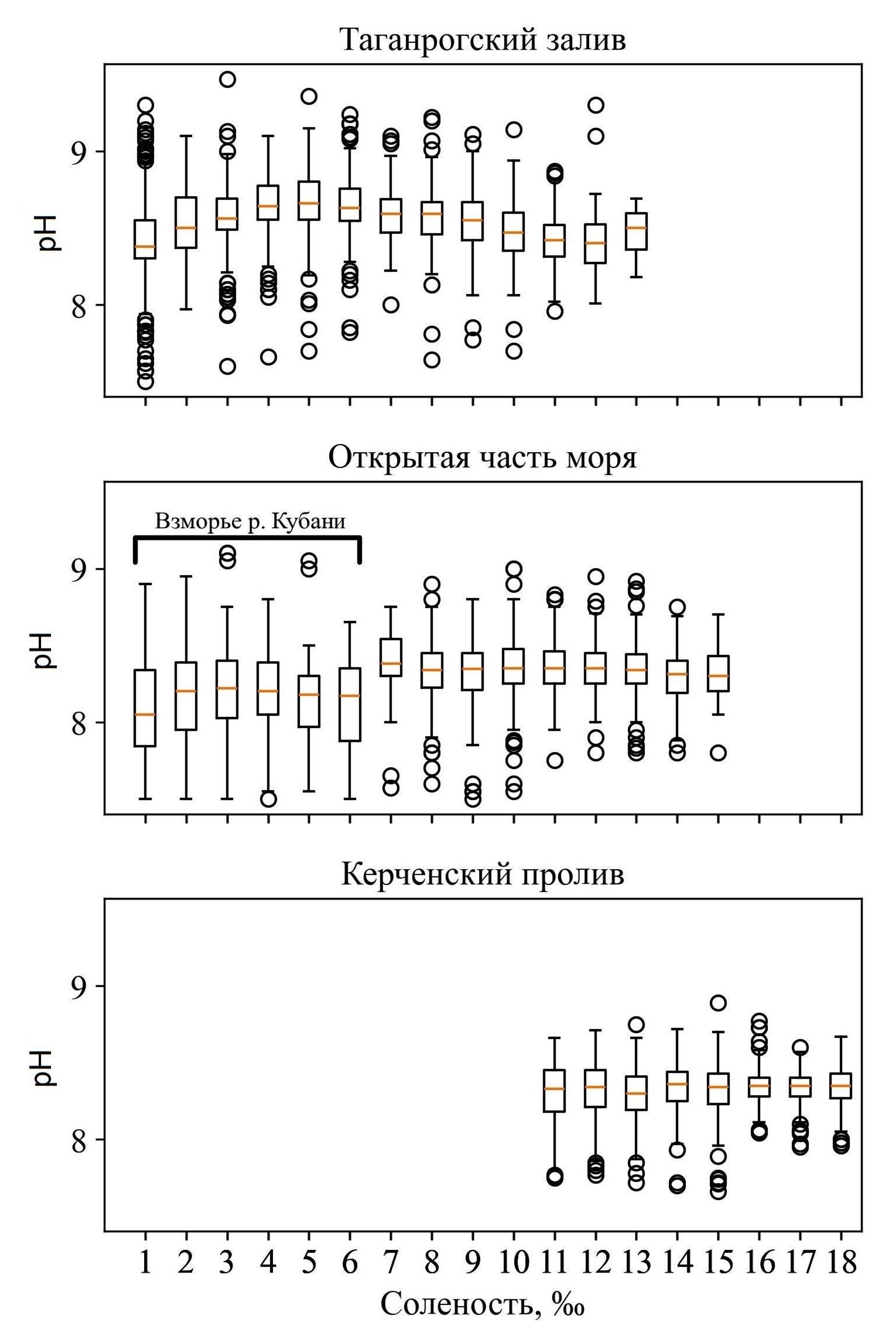 В Таганрогском заливе в поверхностном слое отмечен рост рН в летнее и осеннее время, что можно объяснить увеличением продуцирования органического вещества на фоне уменьшения солености начиная со второй половины 1970-х гг. и ростом температуры воды в первое десятилетие XXI в.