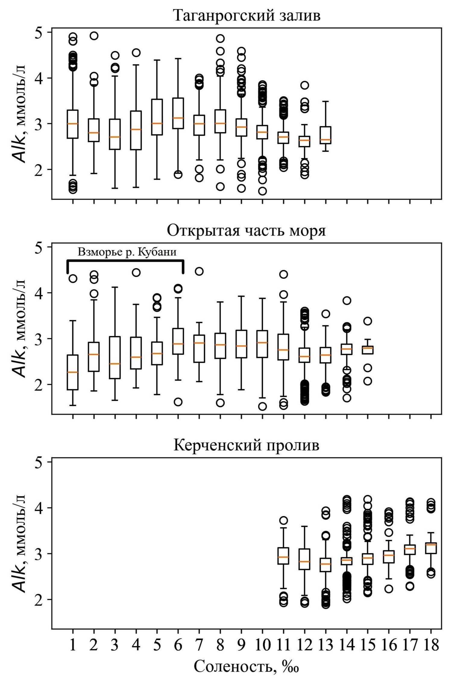 Рис. 4. Диаграмма размаха значений Alk в Азовском море и Керченском проливе в зависимости от солености