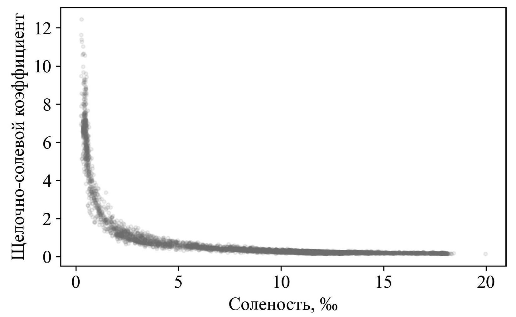 Щелочно-солевой коэффициент иллюстрирует перемешивание разных по генезису водных масс. Он имеет наиболее высокое значение на взморье Дона, что характеризует распресненные речные воды, уменьшаясь экспоненциально в направлении Керченского пролива и Черного моря, отличающихся большей соленостью (рис. 5). Наибольший разброс значений этой величины наблюдается в районах моря с соленостью воды в диапазоне 1–4 ‰.