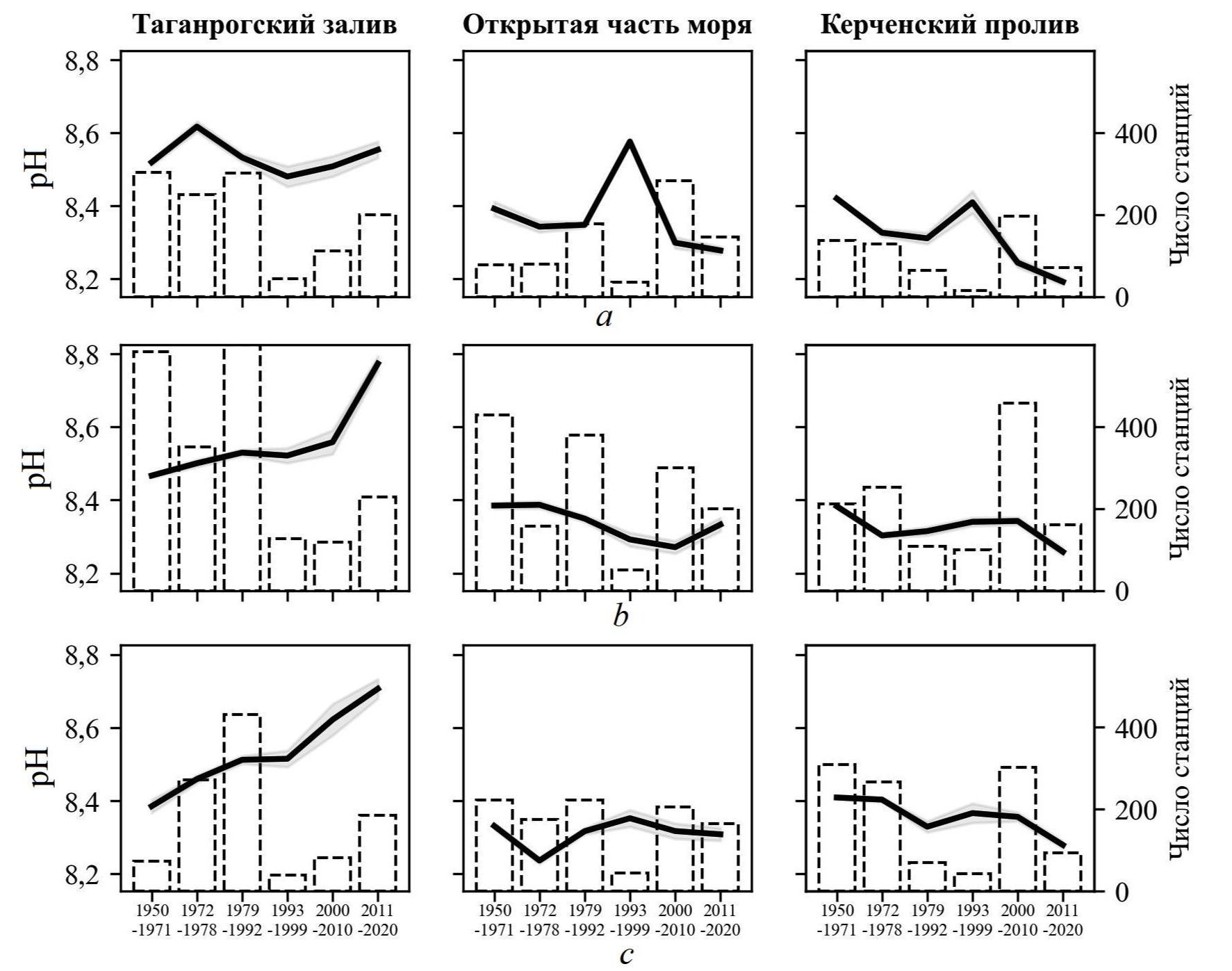 Для открытой части моря (за исключением осеннего периода) и Керченского пролива характерна общая тенденция к снижению рН. На таком фоне можно выделить период 1993–1999 гг., характеризующийся распреснением азовских вод вследствие относительно высокого речного стока, когда наблюдались высокие, по сравнению с предшествующими и последующими периодами, значения рН в весеннее время. Выраженной тенденции изменений средних значений рН осенью в открытом море не наблюдается.