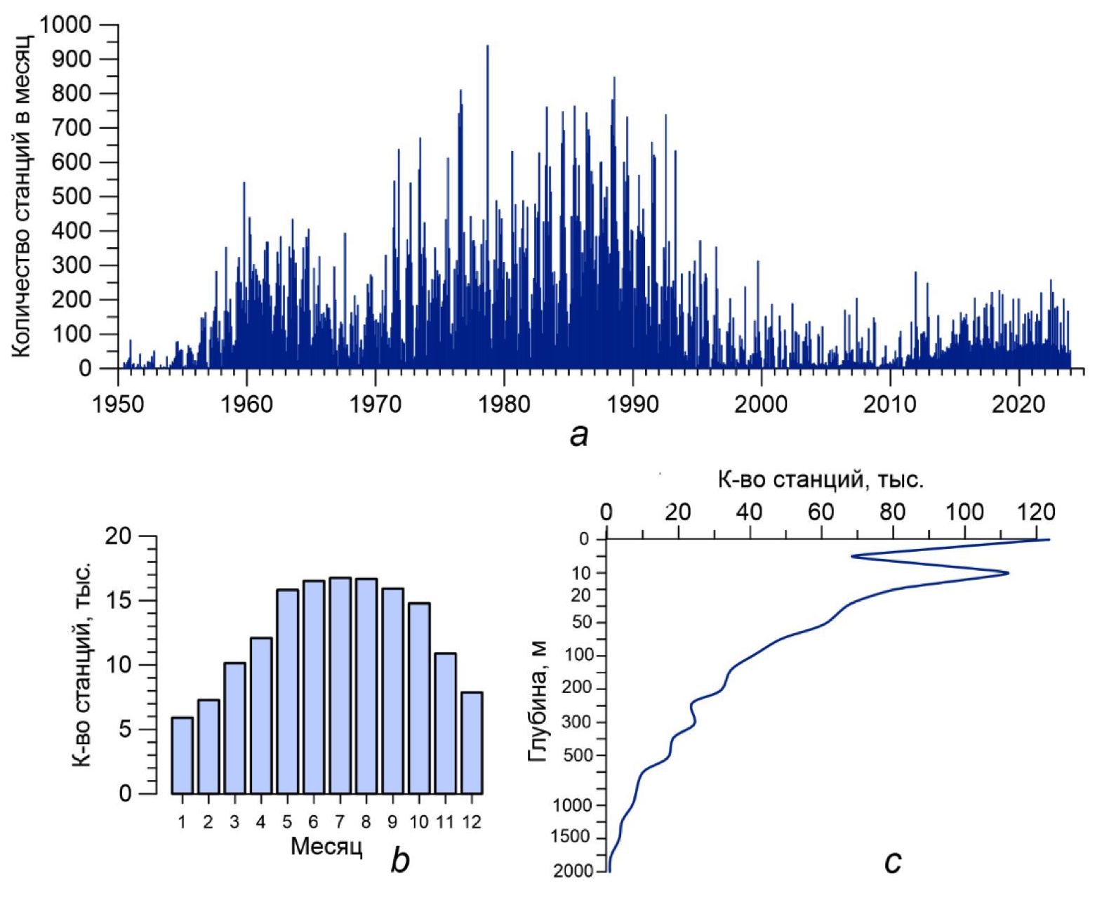 Рис. 2. Количество гидрологических станций в Черном море за период 1950‒2023 гг.: распределение по годам и месяцам (а), по месяцам (b), по глубине (c)