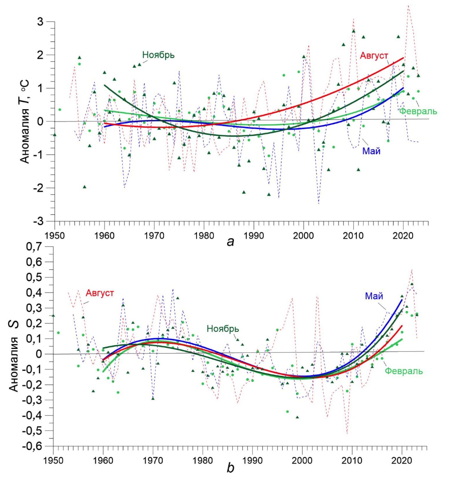 Рис. 7. Временной ход средних по Черному морю среднемесячных аномалий от климатического сезонного хода за период 1950‒2023 гг. на поверхности моря в центральные месяцы гидрологических сезонов года: для температуры воды (a) и солености (b). Тонкие штриховые линии и символы отображают значения аномалий, жирные линии – аппроксимацию полиномами, разными цветами выделены отдельные месяцы