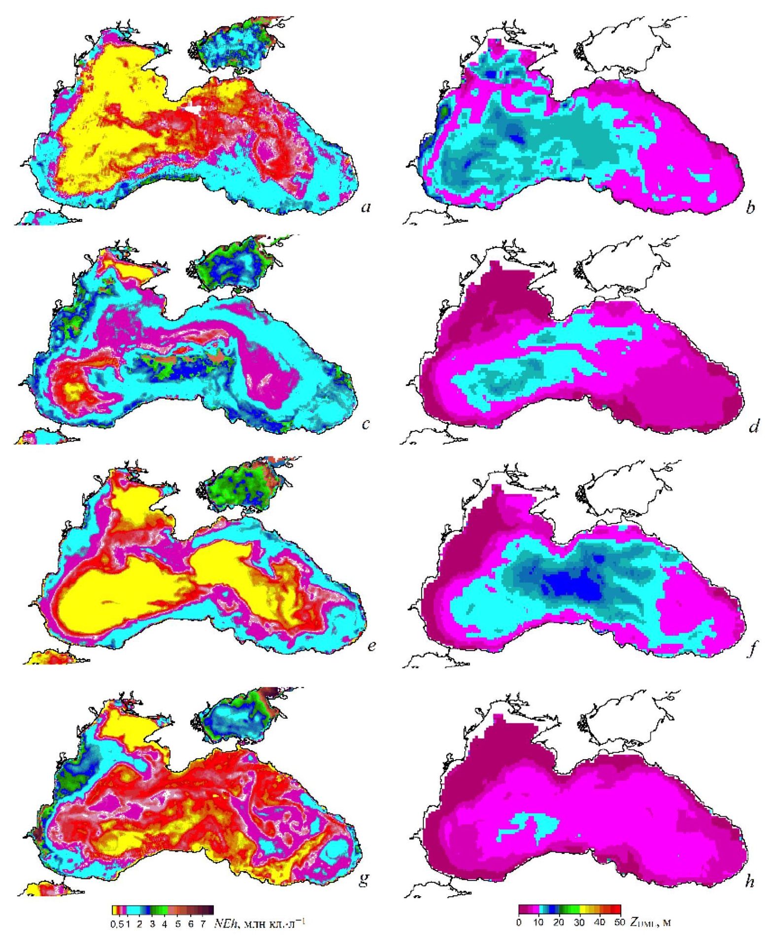 Рис. 7. Карты численности G. huxleyi (NEh) (a, c, e, g) и глубины верхнего перемешанного слоя (ZUML) (b, d, f, h) в начале «цветения» во второй половине мая 1998 (a, b), 2002 (c, d), 2004 (e, f), 2008 гг. (g, h) (источник данных о ZUML – работа [32])