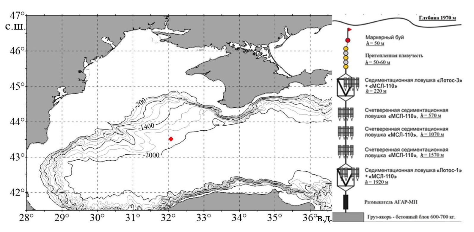 Для отбора проб использовались два типа седиментационных ловушек: первый – с возможностью получения непрерывного по времени сбора материала с заданным временем экспозиции (дифференциальные 12-стаканные седиментационные ловушки «Лотос-3»), второй – интегральные малые цилиндрические седиментационные ловушки МСЛ-110, которые собирают материал в течение всего времени работы станции [1]. На рис. 1 показан район установки седиментационных ловушек. Обсерватория АГОС была установлена в ходе 119-го рейса НИС «Профессор Водяницкий» 24 сентября 2021 г., подъем станции выполнен 4 октября 2022 г. в ходе 124-го рейса этого научно-исследовательского судна. Для интегрального сбора материала в течение года были установлены МСЛ на глубинах 218, 568, 1068, 1568 и 1918 м. На глубинах 218 м («Лотос-3») и 1918 м (ловушка «Лотос-1» не сработала, данные в работе не обсуждаются) были установлены дифференциальные седиментационные ловушки со временем экспозиции 30 сут. Таким образом, период работы АГОС на разных глубинах и с заданной дискретностью сбора ВВ составил 12 мес (375 сут), он охватывал все сезоны с сентября 2021 г. по октябрь 2022 г. Для сохранения собираемого материала в условиях, максимально приближенных к естественным, емкости-приемники заполняли 4%-ным раствором хлорида натрия, что в два раза превышает среднюю соленость вод Черного моря.