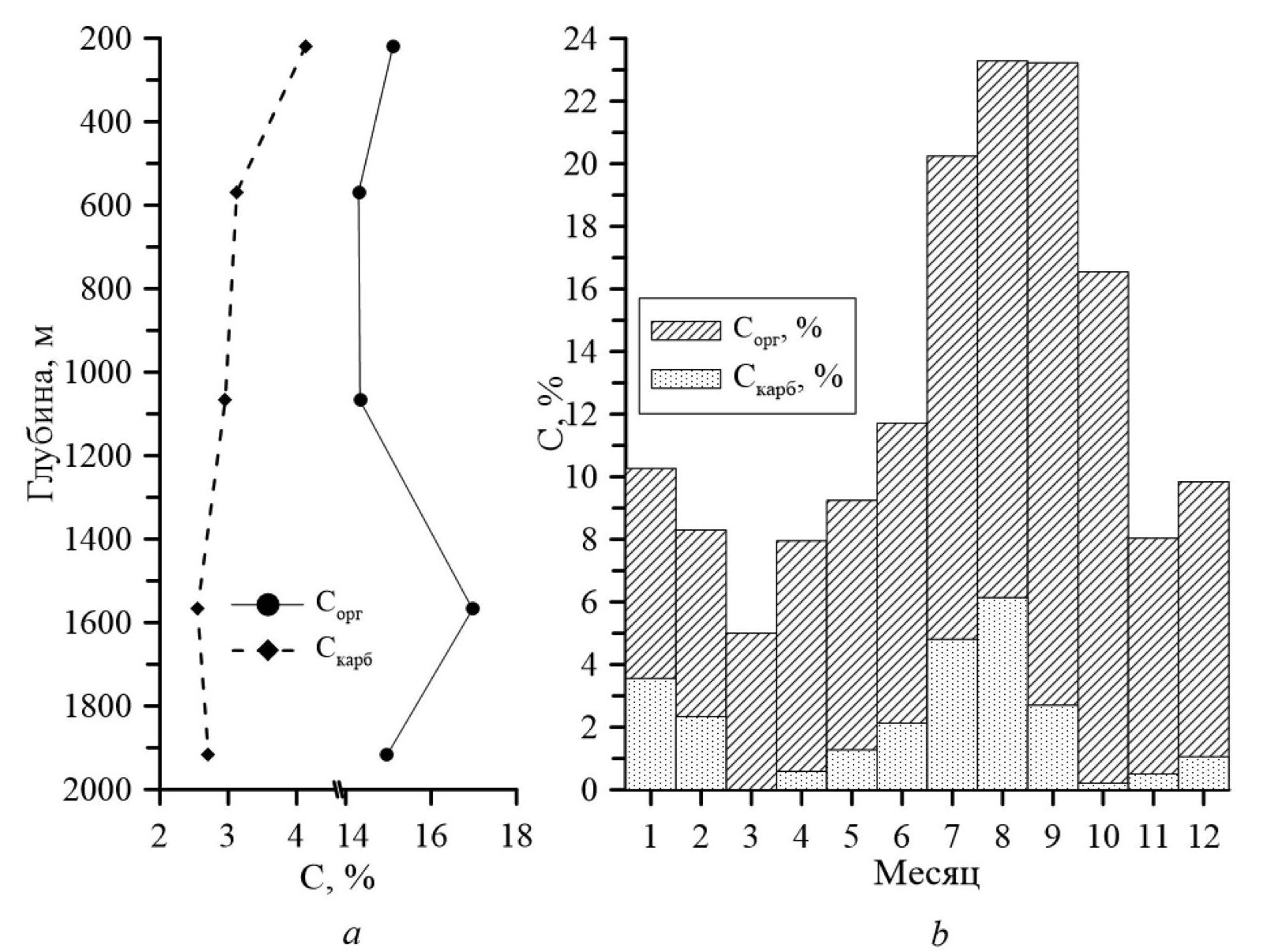 Рис. 3. Распределение органической (Сорг) и неорганической (Скарб) форм углерода с глубиной (а) и в течение года (b)