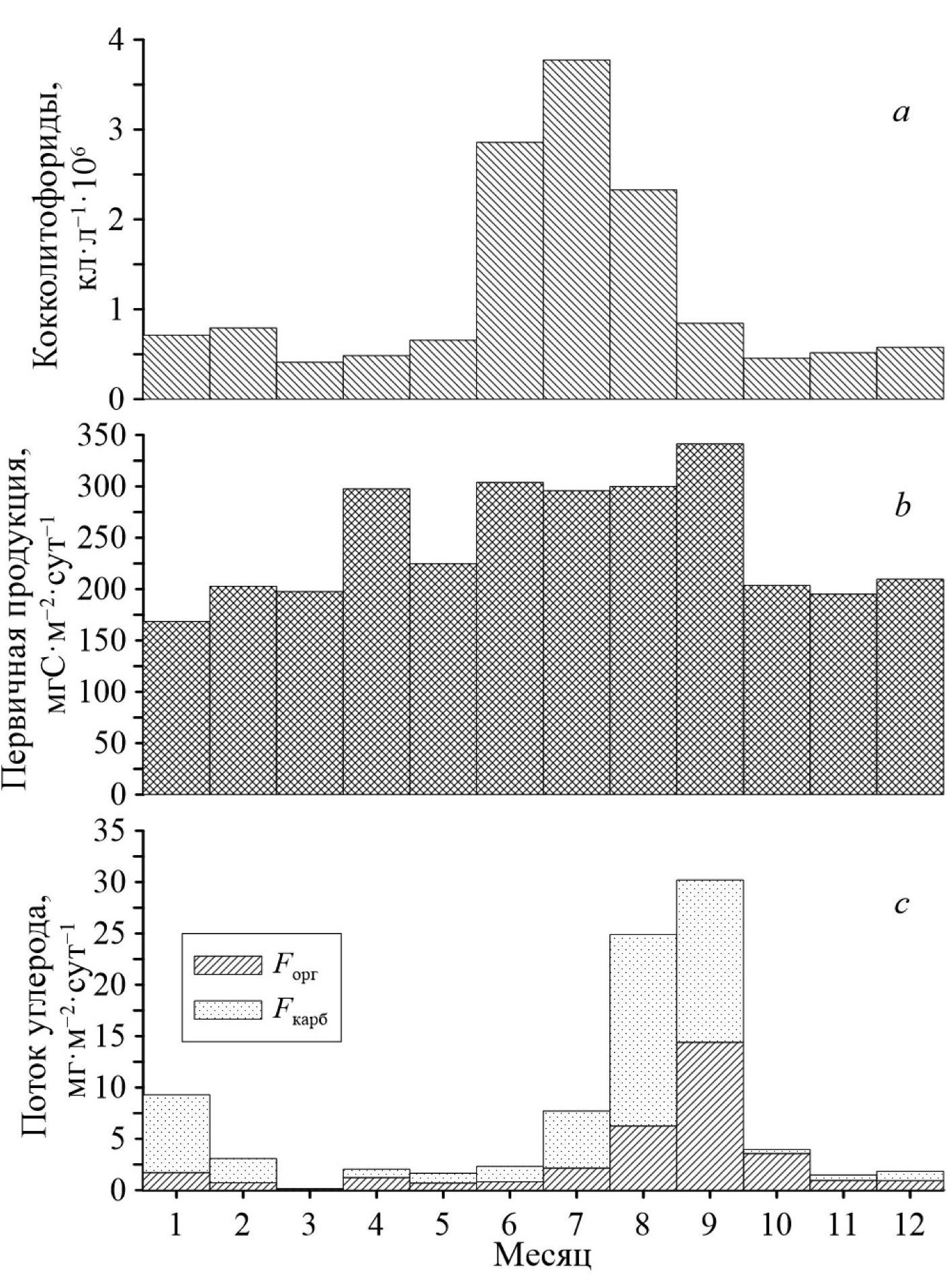 Рис. 5. Концентрации кокколитофорид (a) и первичной продукции (b) в районе постановки ловушки по спутниковым данным за 2022 г.; сезонный ход потоков органического (Fорг) и неорганического углерода в составе карбонатов (Fкарб) во взвешенном веществе на глубине 218 м по данным ловушки «Лотос-3» (c)