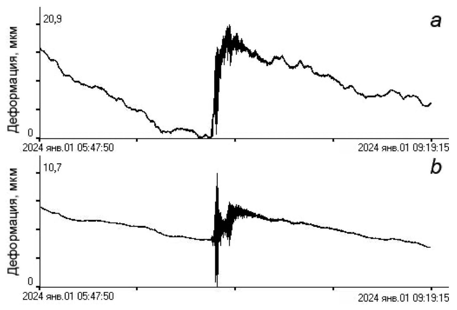 Самым достопримечательным (пока) результатом полученной записи является регистрация лазерными деформографами цунамигенного землетрясения, произошедшего в Японском море, в результате которого на побережье Приморского края пришла волна цунами высотой до 0,3 м. На рис. 15 приведены записи 52,5-метрового и 17,5-метрового лазерных деформографов, которые зарегистрировали землетрясение и деформационные аномалии (скачки деформации), вызванные подвижками морского дна в эпицентре. Землетрясение произошло на северо-восточной оконечности п-ова Ното (Япония) 1 января 2024 г. в 07:10:09 UTC с магнитудой 7,6. По уровню данной деформационной аномалии можно рассчитать смещение морского дна, которое привело к образованию цунами. В соответствии с работой [13], расчетное смещение морского дна по записи 52,5-метрового лазерного деформографа составило 5,4 м в эпицентре землетрясения.
