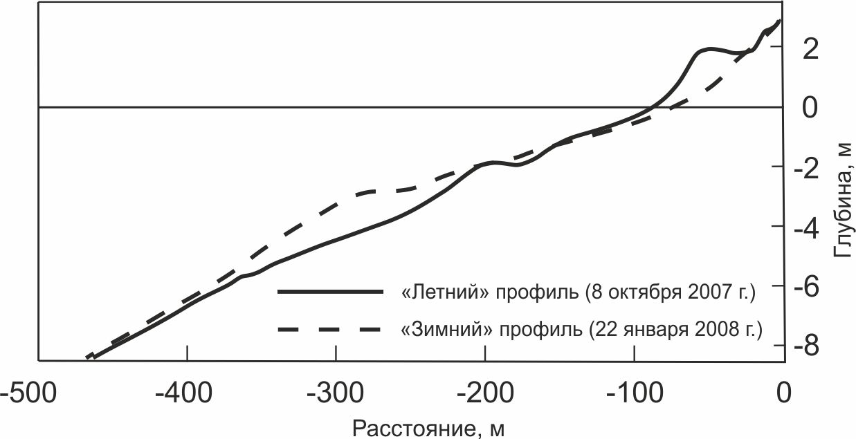 Следует отметить, что волновые условия побережья Калифорнии, где впервые исследованы сезонные деформации песчаного берега, отличаются интенсивным волнением в штормовой сезон и достаточно продолжительным периодом воздействия пологих волн тихоокеанской зыби в умеренный сезон, что определяет соответствующие различия берегового профиля (см. рис. 1). В условиях с ограниченным разгоном волн, где в штормовой период преобладают короткие и крутые ветровые волны, а действие зыби выражено незначительно, предельные состояния профиля, характерные для разных сезонов, могут быть менее контрастными [8, 9].