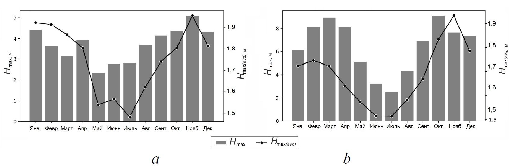 Для двух исследуемых акваторий в годовой динамике штормовой активности есть общие черты. Выявлено, что максимальные высоты волн и их средние значения ( , ) имеют хорошо выраженную сезонную изменчивость с минимумом в мае – июле, после которого до ноября интенсивность волнения возрастает (рис. 5).