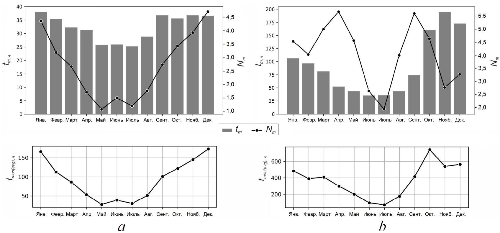 На первом этапе исследования был выполнен анализ сезонности в распределении штормовой активности. Для каждого месяца были определены следующие показатели (рис. 5, 6):