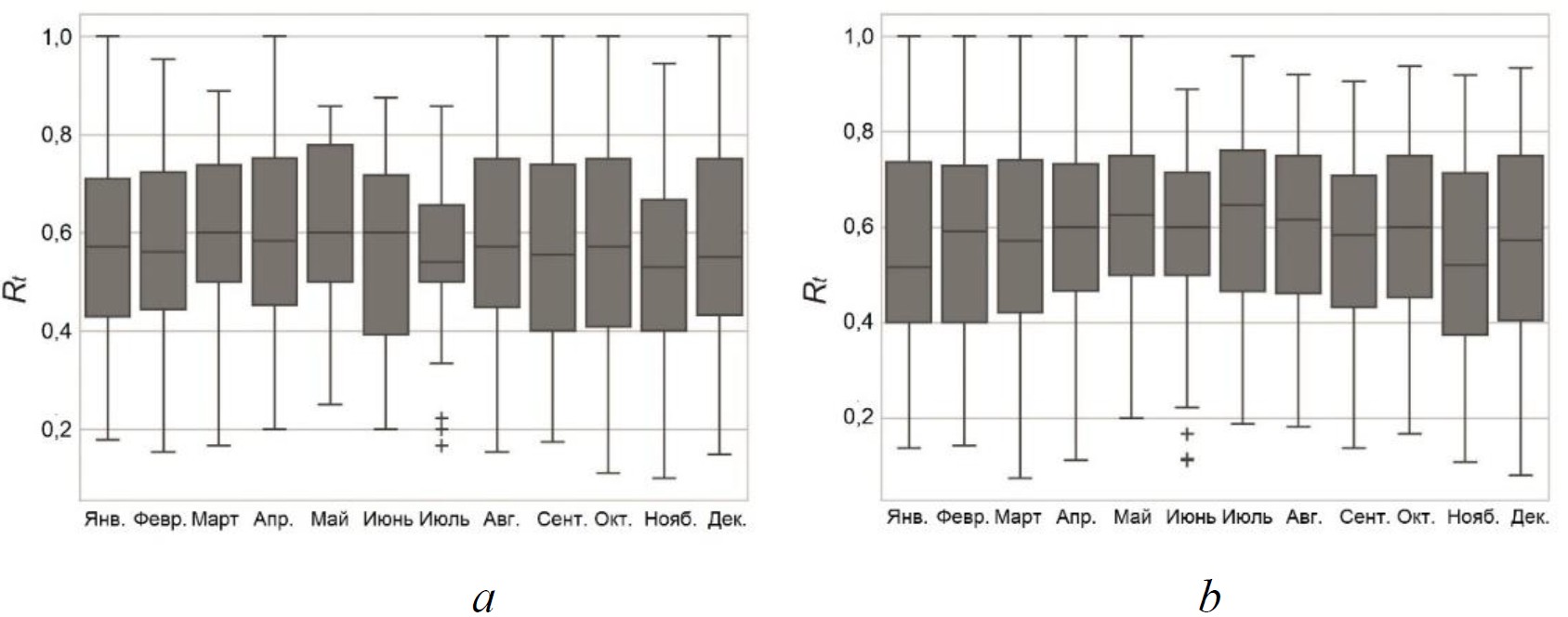 Рис. 5. Распределение значений и по месяцам: а – для Юго-Восточной Балтики; b – для Западной Камчатки