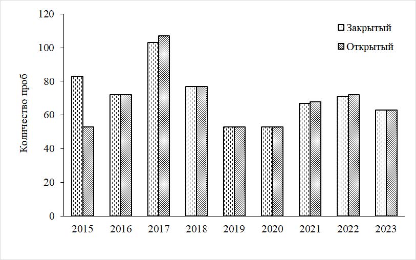 Рис. 2. Количество проб атмосферных выпадений, отобранных в открытый и закрытый осадкосборники в г. Севастополе