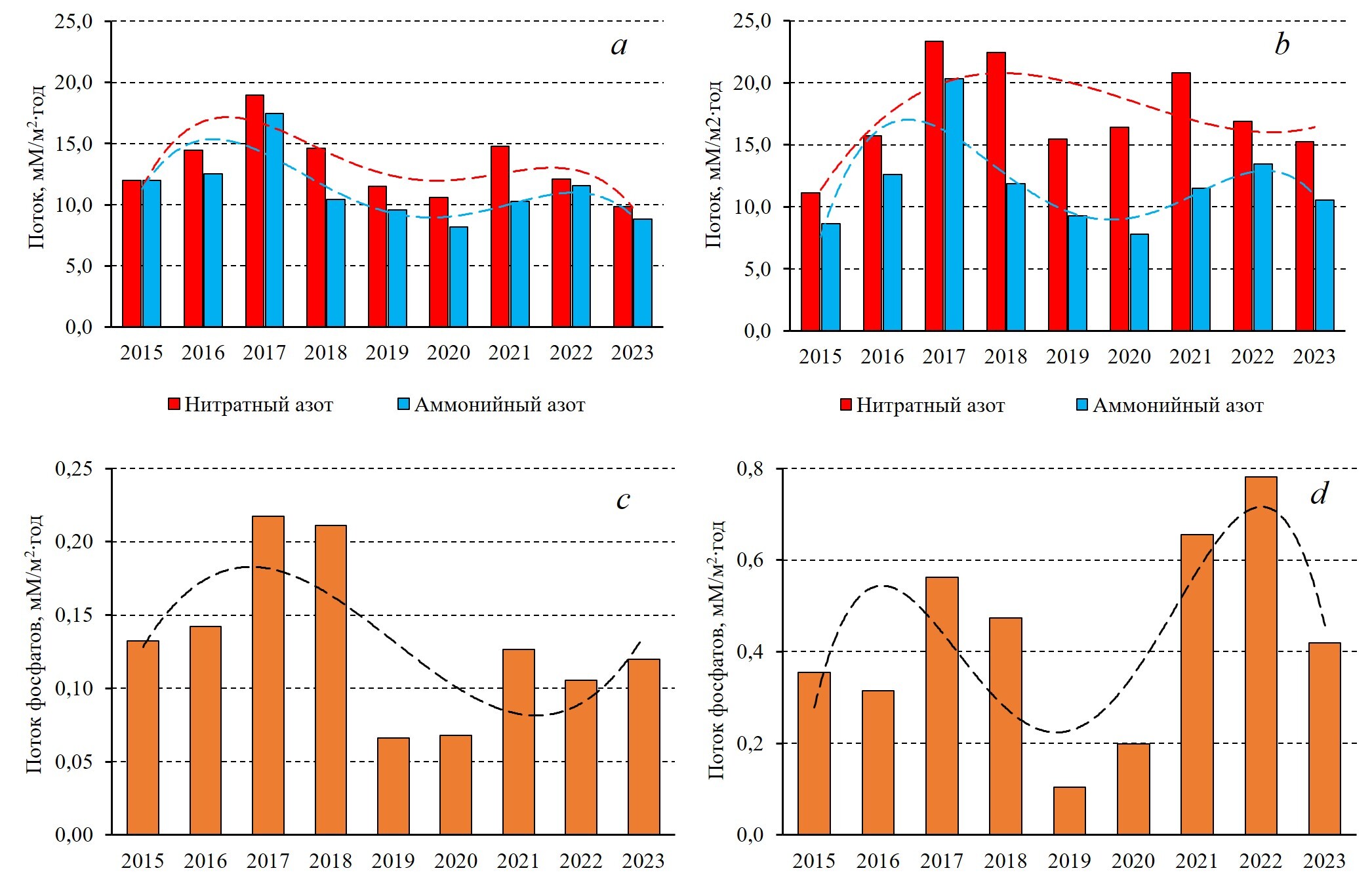 Рис. 4. Межгодовое изменение потока неорганических форм азота в г. Севастополе из закрытого (а) и открытого (b) осадкосборников, фосфатов из закрытого (c) и открытого (d) осадкосборников. Шриховыми линиями показаны линии тренда