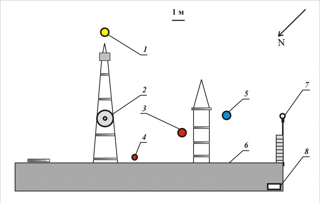 Рис. 1. Схема расположения основных измерительных комплексов на океанографической платформе во время проведения экспериментов в мае – июне 2021 г.: 1 – акустический доплеровский профилограф DVS-6000; 2 – измерительный комплекс «Сигма-1»; 3 – измеритель скорости течения комплекс «Восток-М»; 4 – измерители течения МГИ-1308 (4 шт.); 5 – акустический доплеровский профилограф WorkНorse Monitor; 6 – океанографическая платформа; 7 – струнный волнограф; 8 – метеокомплекс