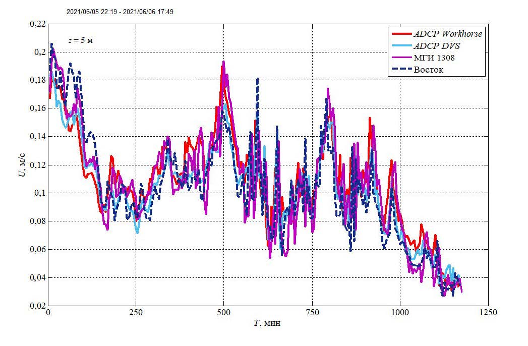 Рис. 2. Модуль скорости среднего течения, по данным измерений различными приборами на глубине 5 м в районе океанографической платформы 5–6 июня 2021 г. Данные приведены к дискретности 5 мин