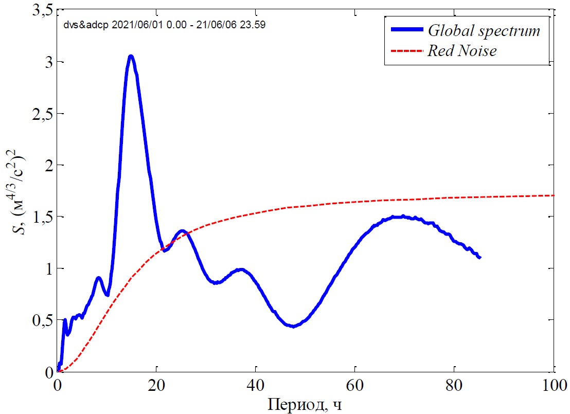 Основной массив данных, выбранных для анализа синхронных измерений скорости горизонтального течения в разнесенных точках и расчета структурных функций, получен в активный операционный период с 01.06.2021 по 06.06.2021 комплексами DVS-6000 и WorkНorse Monitor (3 и 8 на рис. 1). Фрагмент записей представлен выше на рис. 2. Структурные функции рассчитывались по соотношениям (1) и (2), во втором случае временной сдвиг варьировался от 5 мин до 1 ч. Изменчивость продольного структурного параметра за указанный период приведена на рис. 4, глобальный спектр, рассчитанный с помощью вейвлет-анализа, – на рис. 5.