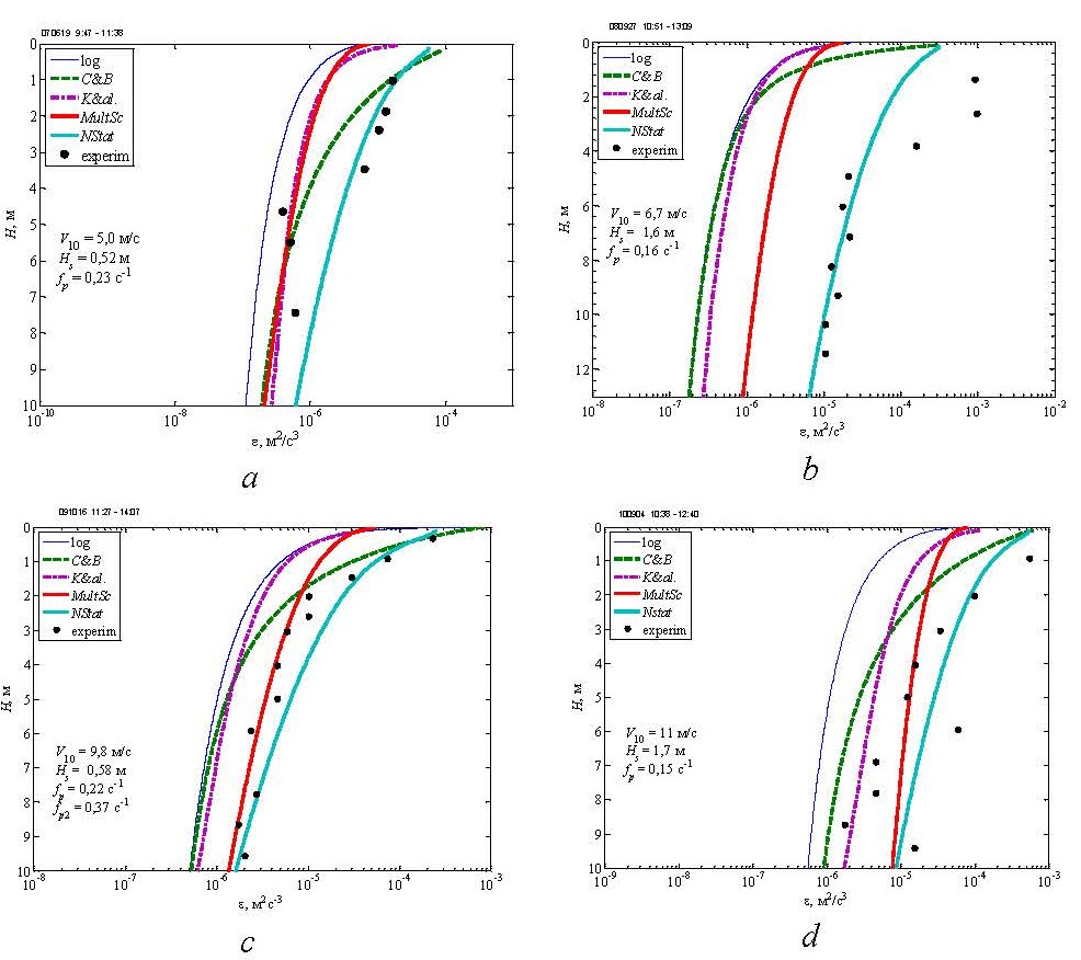 На рис. 7 представлены экспериментальные данные о скорости диссипации при слабых ветрах и результаты расчетов по различным моделям, включая описанную в настоящей работе усовершенствованную нестационарную модель. Краткое описание моделей, использовавшихся для сопоставления, приведено в Приложении. Как видно из рисунков, введение дополнительного источника турбулентности через структурную функцию существенным образом улучшает соответствие расчетов и натурных измерений. На рис. 8 приведены примеры расчетов и экспериментальных данных при умеренных и сильных ветрах. Здесь для иллюстрации предпочтение было отдано случаям, когда другие модели недостаточно хорошо соответствовали экспериментам. Совпадение данных предложенной модели с результатами измерениями при таких условиях также вполне удовлетворительное.