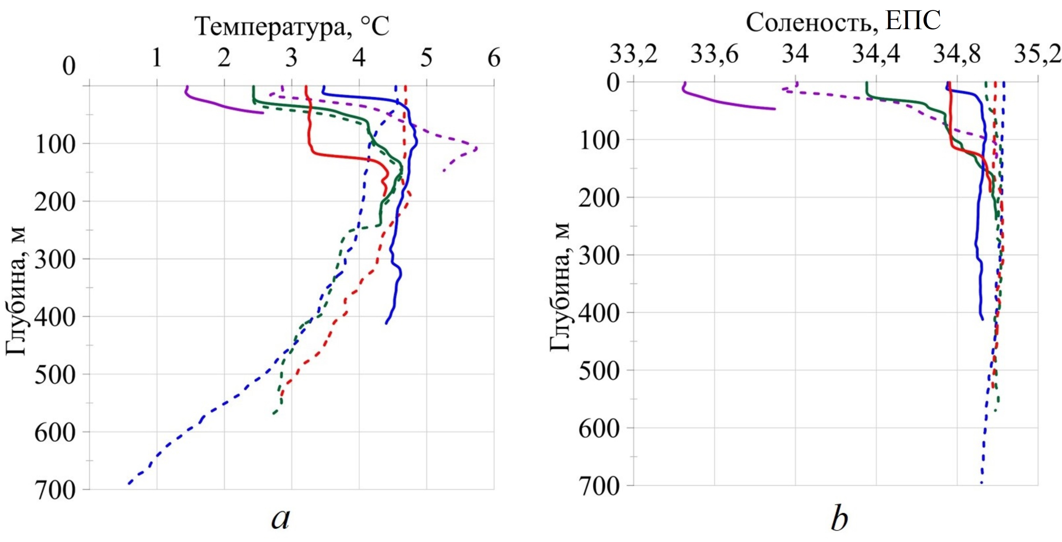 Fig.4. Vertical distribution of temperature (left) and salinity (right) in the Marginal Frontal Zone on the sections in 2019 (a, b) and 2023 (c, d). Purple dotted line denotes the isotherm and isohaline along which the frontal sections of temperature and salinity run