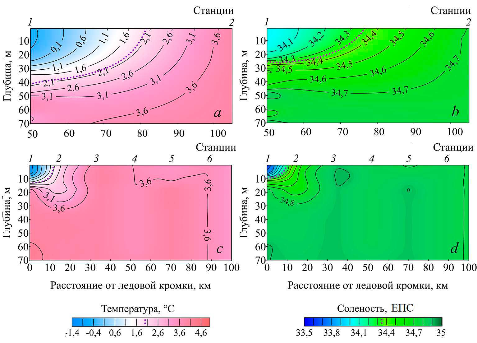 В 2023 г. арктические воды прослеживались в верхнем 10-метровом слое. Горизонтальный градиент температуры между ст. 1 и 3 достигал 0,15 °С/км на поверхности моря и уменьшался до нуля на глубине 30 м. Градиент солености уменьшался от 0,04 ЕПС/км на поверхности до нуля на глубине 20 м. Максимальные градиенты температуры и солености наблюдались между ст. 1 и 3 и составляли 0,24 °С/км и 0,07 ЕПС/км. Если проводить фронтальный раздел по этой линии, то он будет находиться в 7 км от поля крупнобитого льда сплоченностью 8 баллов. Глубина залегания фронтальной зоны не превышала 30 м.