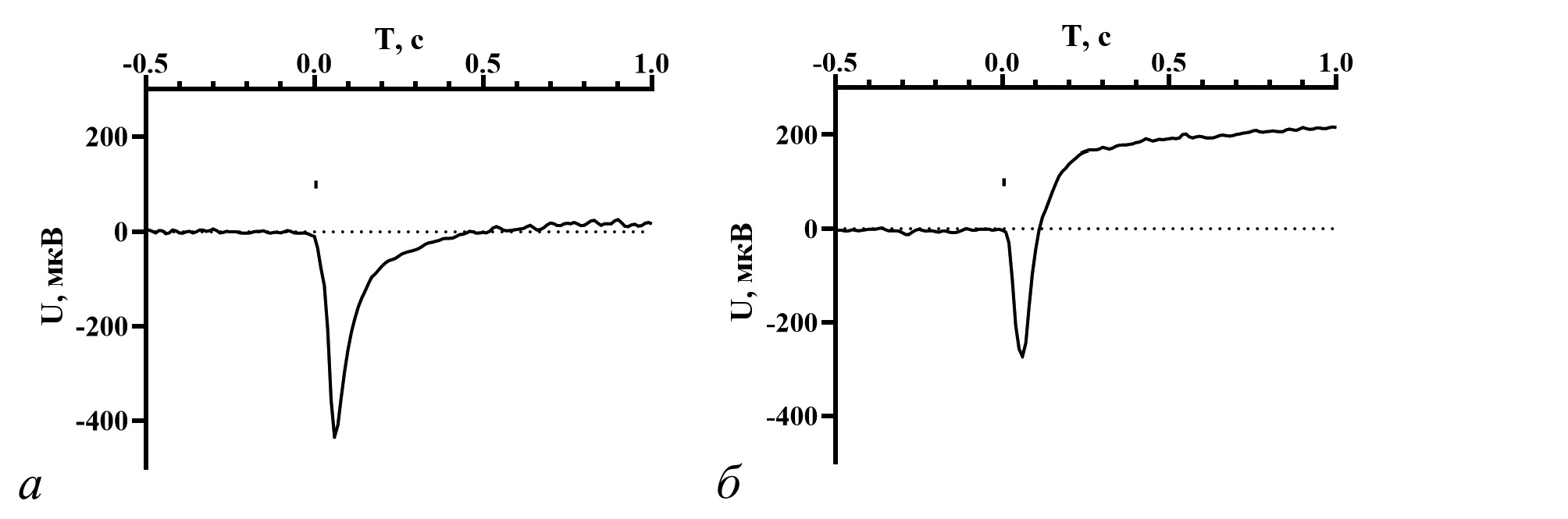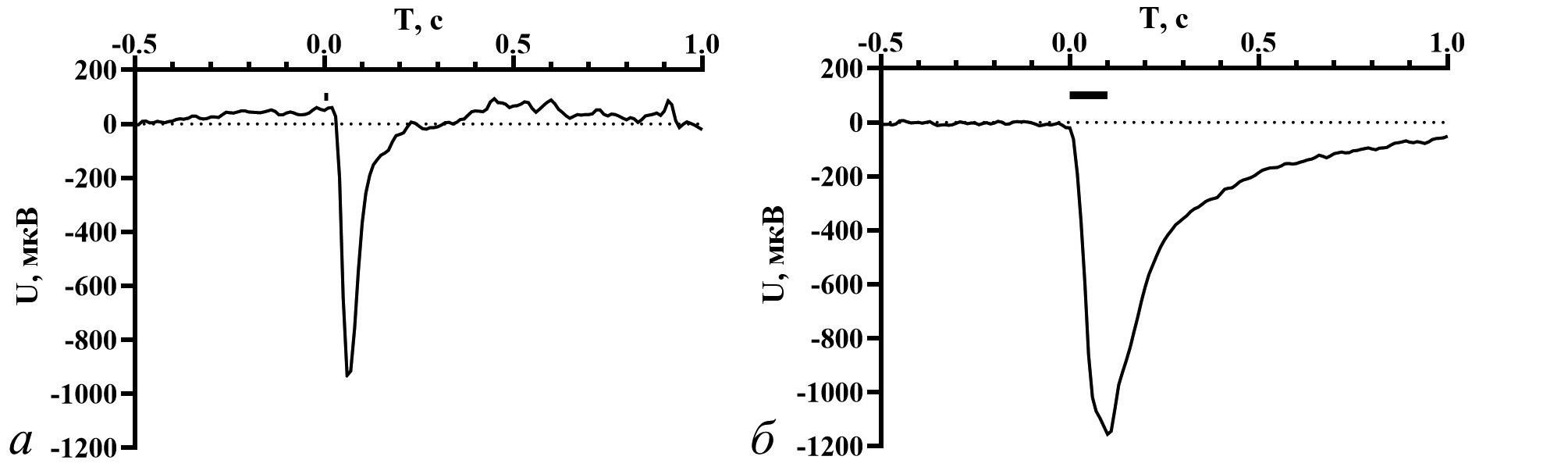Рис. 3. Оригинальная запись ЭРГ интактного таракана дикого типа в ответ на 10 мс вспышку УФ (365 нм) света средней интенсивности (4.5×1010 фотонов/мм2/мс). а — таракан № 9 (19.05.2022), овершута нет; б — таракан № 12 (06.06.2022), овершут есть. Отметка стимула показана над кривыми.