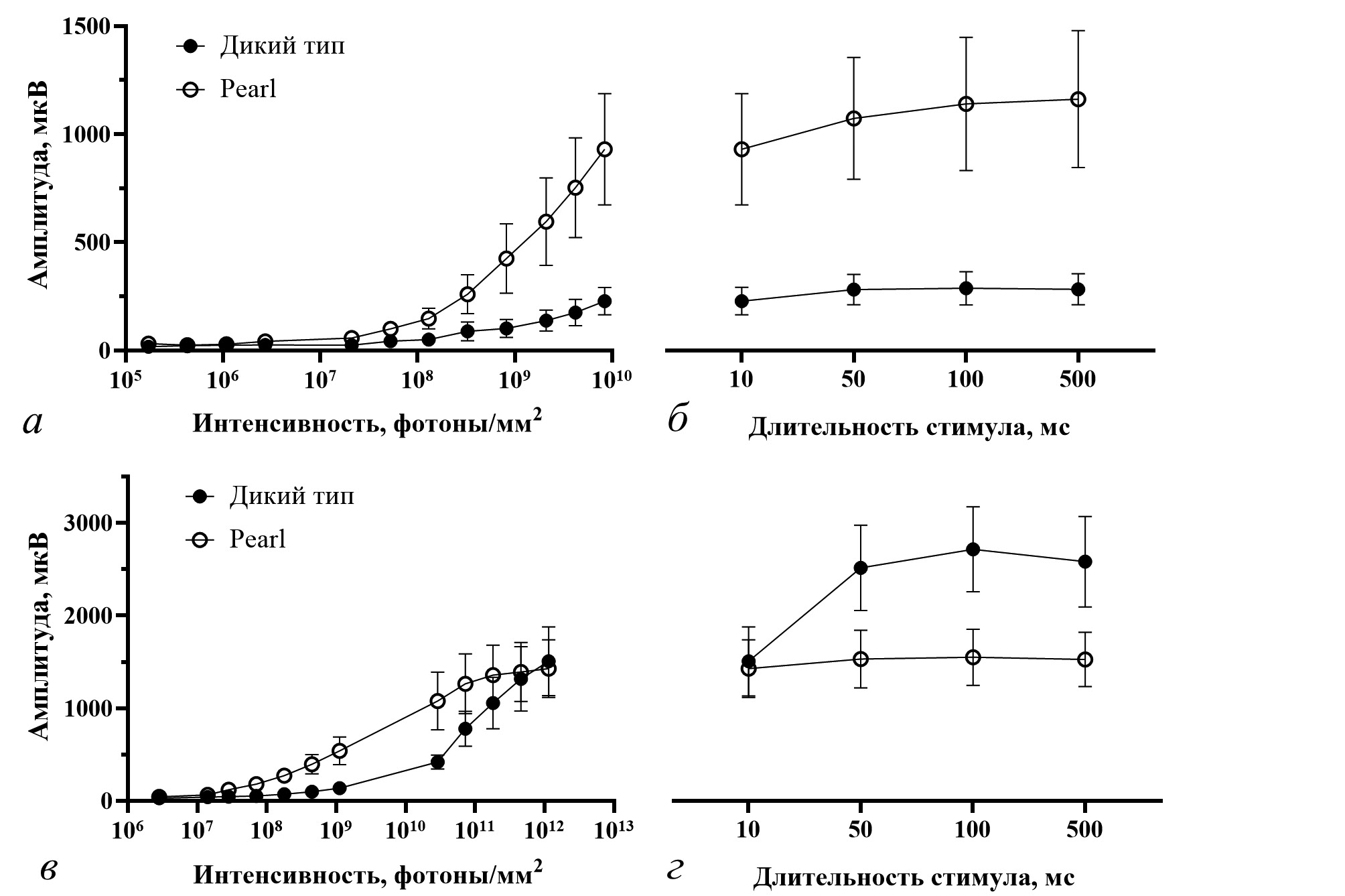 Рис. 2. Амплитуды ответов на короткие (1–10 мс) вспышки возрастающей интенсивности зеленого (а, б) и УФ (в, г) света. Амплитуды ответов на стимулы длительностью 10–500 мс (б, г). Показаны средние и ошибки среднего.
