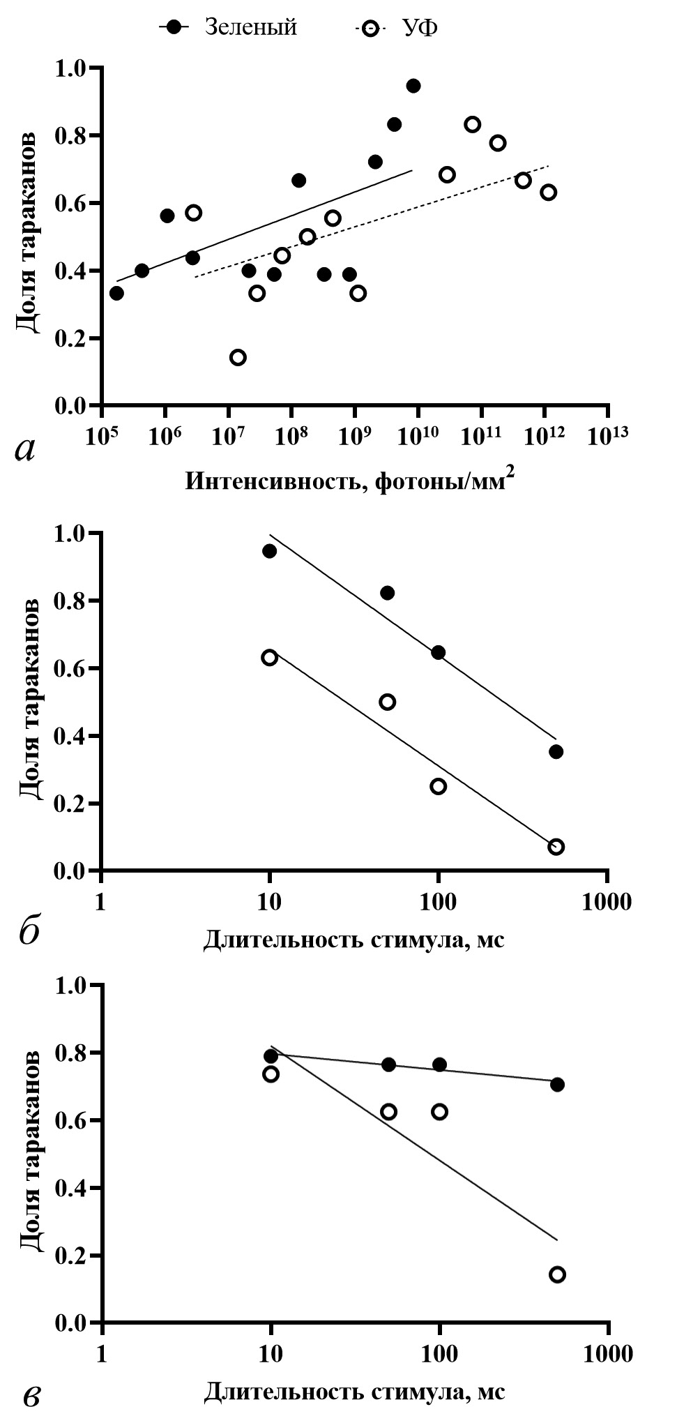Частота встречаемости овершутов не зависела от длины волны предъявляемого света, но росла с увеличением интенсивности сигнала (рис. 4, а). При увеличении длительности стимула максимальной интенсивности, 8.4×108 фотонов/мм2/мс для зеленого света и 1.1×1011 фотонов/мм2/мс для УФ (см. табл. 1), частота овершутов снижалась (рис. 4, б). Однако при оценке регистрируемого сигнала через 1 с после начала стимуляции ответы на зеленый, но не УФ-свет увеличивающейся длительности не показывали снижения частоты овершутов с удлинением стимула (рис. 4, в).