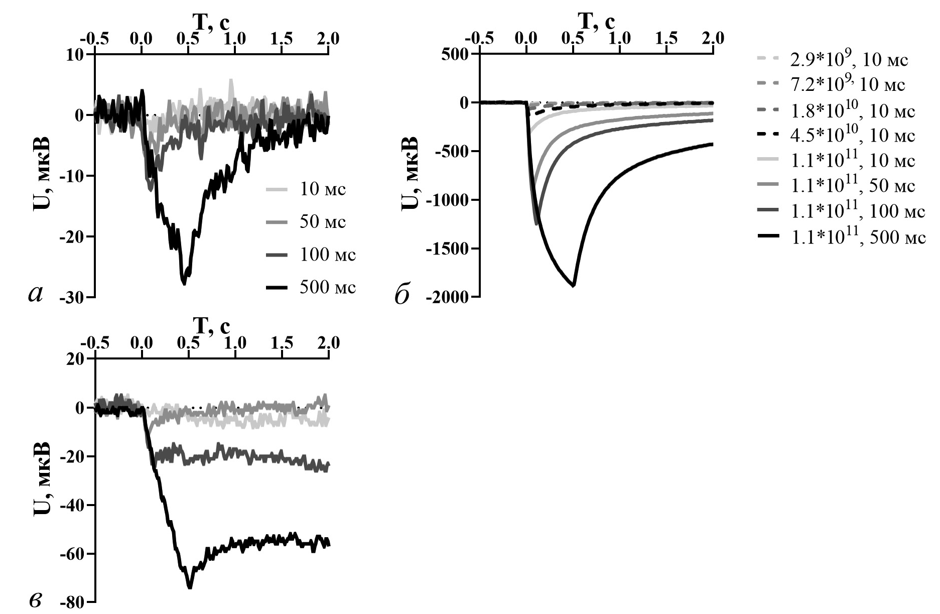 При увеличении длительности стимуляции до 50 мс росла амплитуда, до 100 мс и более на максимальных интенсивностях рост амплитуды уменьшался или прекращался, после пика ответа следовало плато. После выключения светового стимула у некоторых препаратов наблюдался овершут — переход потенциала через нулевую линию в область положительных значений (рис. 3).