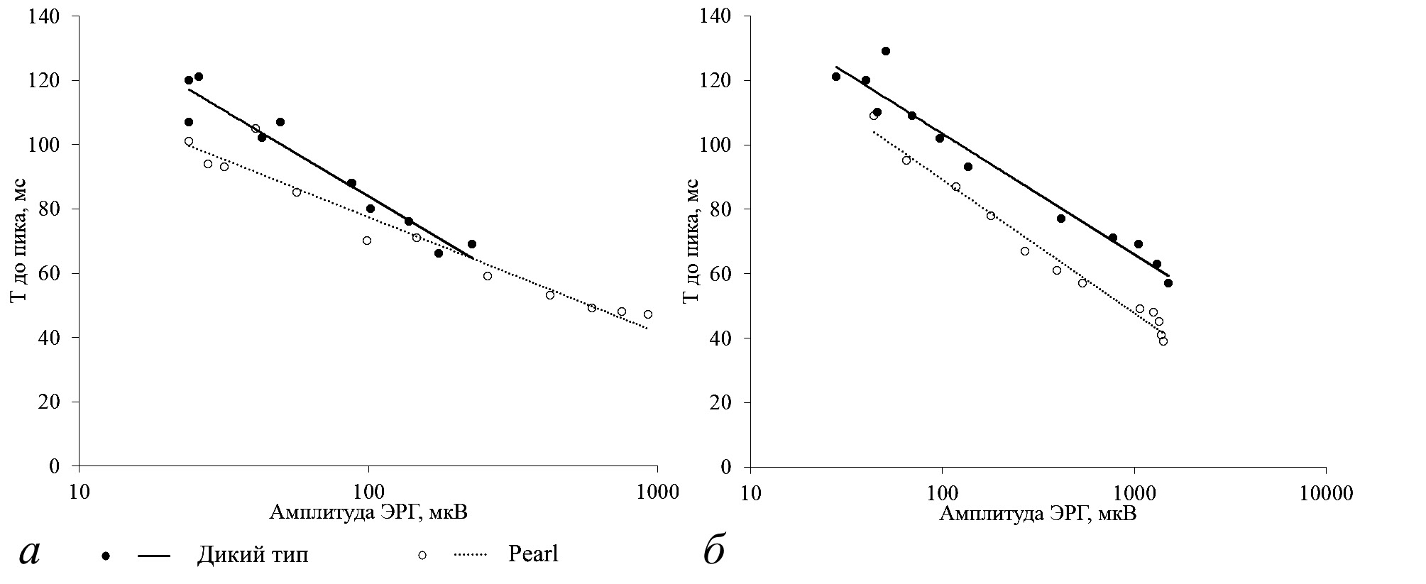 Рис. 8. Зависимость времени до пика от амплитуды ответа: а — зеленый, б — УФ свет. Приведены средние значения для ответов на 10 мс вспышки света и логарифмическая аппроксимация.