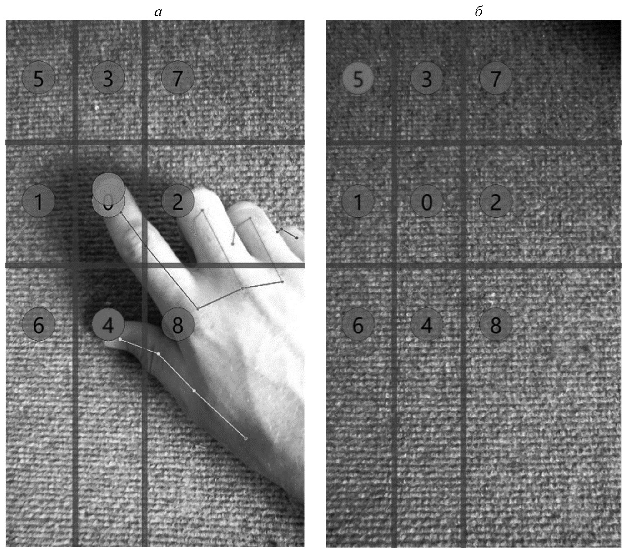 В эксперименте, когда для управления использовался указательный палец руки испытуемого, веб-камера Logitech HD Webcam C615 (частота регистрации 30 кадров в секунду) была закреплена сверху над поверхностью, по которой испытуемый перемещал руку, и направлена на нее. Поверх транслируемого изображения с камеры во время эксперимента с обратной связью накладывалась сетка с девятью маркерами (рис. 1, а), а координаты кончика указательного пальца в пикселях на потоковом видео принимались за координаты управляемого испытуемым маркера. В режиме работы без обратной связи пользователю демонстрировалось статичное изображение (рис. 1, б) с сеткой из девяти маркеров.