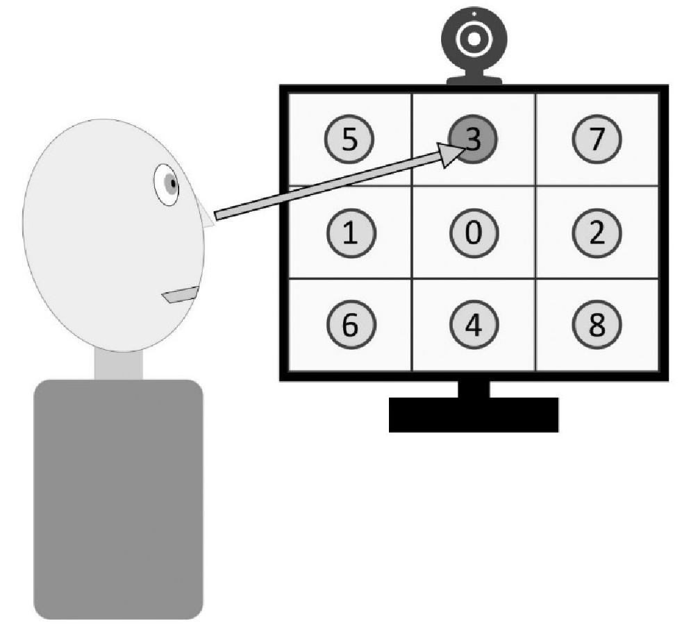 Программно-аппаратная платформа была общая для всех трех экспериментов. В каждом эксперименте испытуемый тем или иным образом управлял оранжевым маркером, отображаемым на мониторе перед ним. Монитор с диагональю 22 дюйма и разрешением 1 920 × 1 080 пикселей располагался перед оператором на удобном для него расстоянии. На экране были иные маркеры в сетке 3 × 3, за каждым из которых была закреплена числовая команда от 1 до 9; из них один был маркером цели, к которому испытуемому требовалось подвести как можно ближе свой маркер, а остальные пассивно отображались (рис. 1).