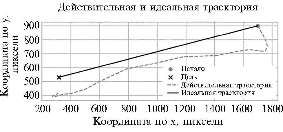 В расчетах использовались следующие показатели: время выполнения задания, которое, согласно протоколу эксперимента, не могло превышать 3 с, и расстояние, которое проходил управляемый пользователем курсор. С учетом того, что управление осуществлялось на экране монитора, расстояние определялось в пикселях. Скорость перемещения управляемого курсора и среднеквадратическое отклонение (СКО) траектории пользователя от идеальной траектории (ИТ), представляющей собой отрезок с началом в точке начального положения курсора и концом в точке, соответствующей исполняемой команде (рис. 3).
