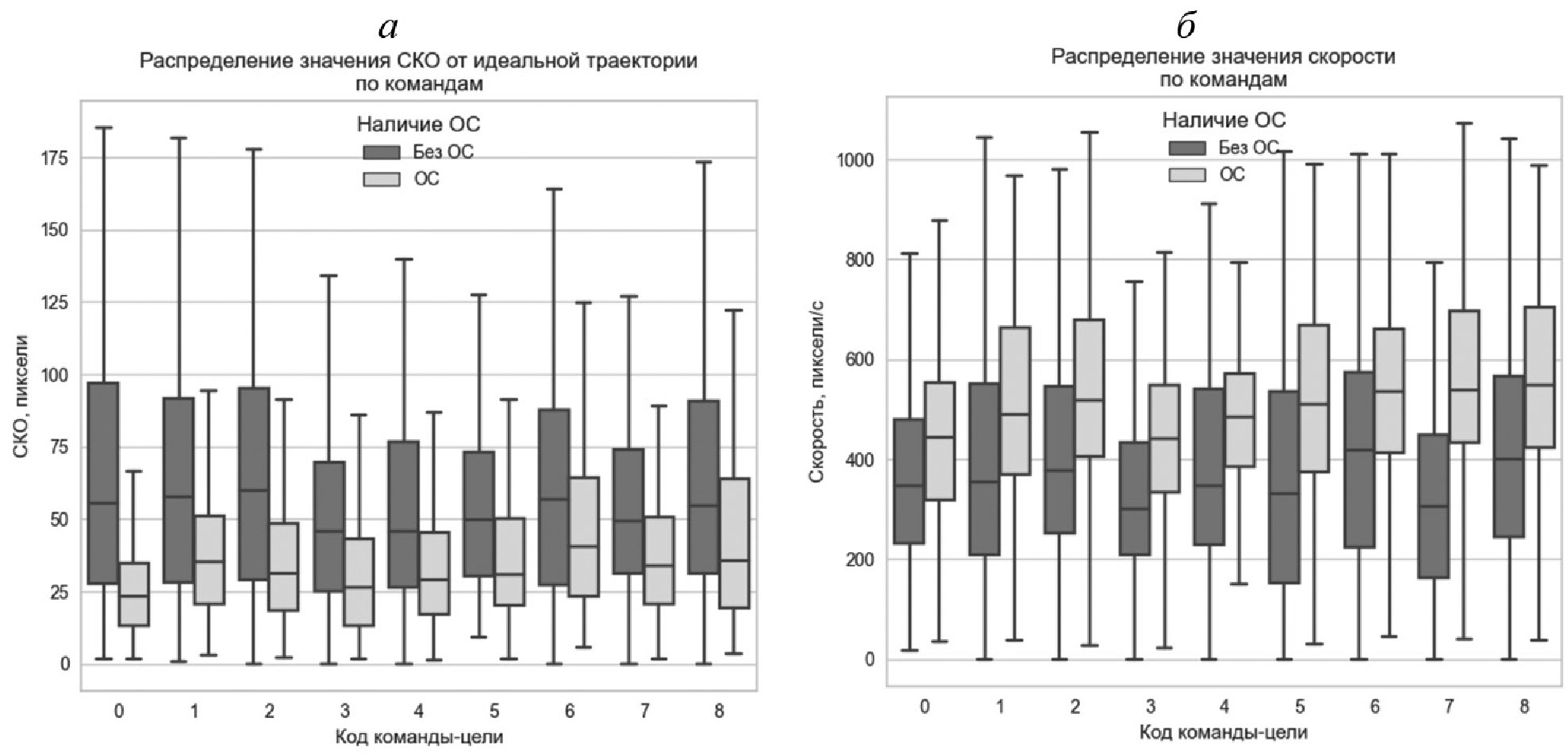 Рис. 5. Диаграмма размаха с наблюдаемыми минимумом и максимумом, не превышающим 1.5 интерквартильного размаха для следующих величин: а — СКО в зависимости от номера цели при работе в режиме генерации команд движением головы. При наличии ОС p ≪ 0.0001, без ОС p = 0.004; б — скорости в зависимости от номера цели при работе в режиме генерации команды движением головы. При наличии ОС (критерий Краскейла–Уоллеса), без ОС p = 0.17.