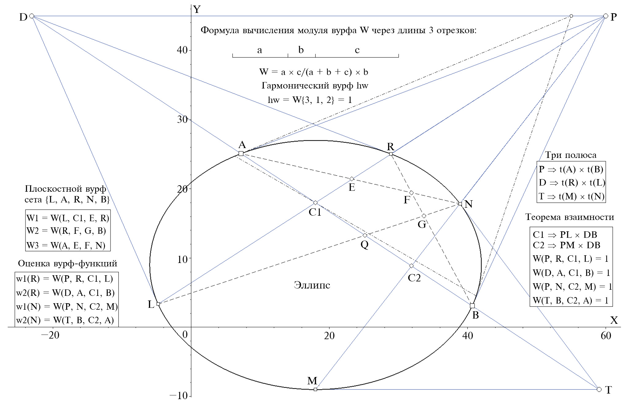 Рис. 1. Полюс-полярные отношения для семейства квадратичных кривых (коник) на примере эллипса, формула вычисления вурфа (через длины трех отрезков) и основные положения теоремы взаимности Ю. Плюккера. Остальные пояснения в тексте