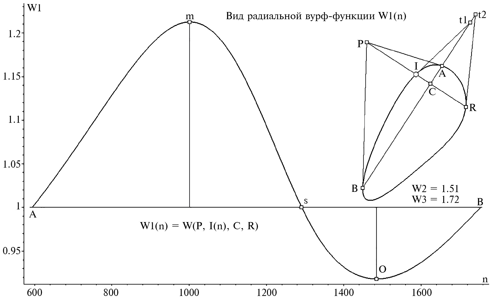Типовой вид двухфазной радиальной W-функции демонстрирует рис. 2. На врезке схема вычисления всех трех ее форм, показывающая: W2(n) и W3(n) не обязаны быть тождественно неотличимыми, как это у э “предписано” теоремой взаимности). В других симуляциях (не включены для показа) W-функции имели как однофазную, так и (редко) трехфазную форму.
