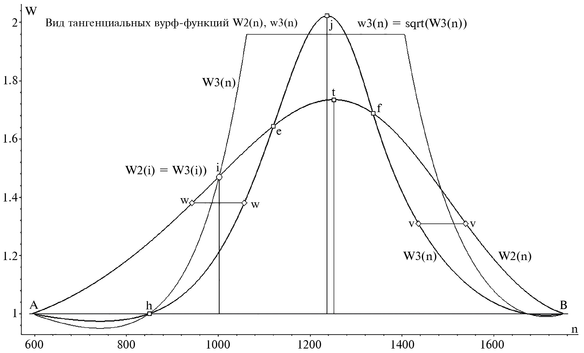 Рис. 3. Способ оптимизации пары тангенциальных W-функций посредством операции извлечения квадратного корня для ординат функции W3(n) с существенно более сильным экстремумом – в сравнении с максимумом у W2(n). Остальные пояснения в тексте