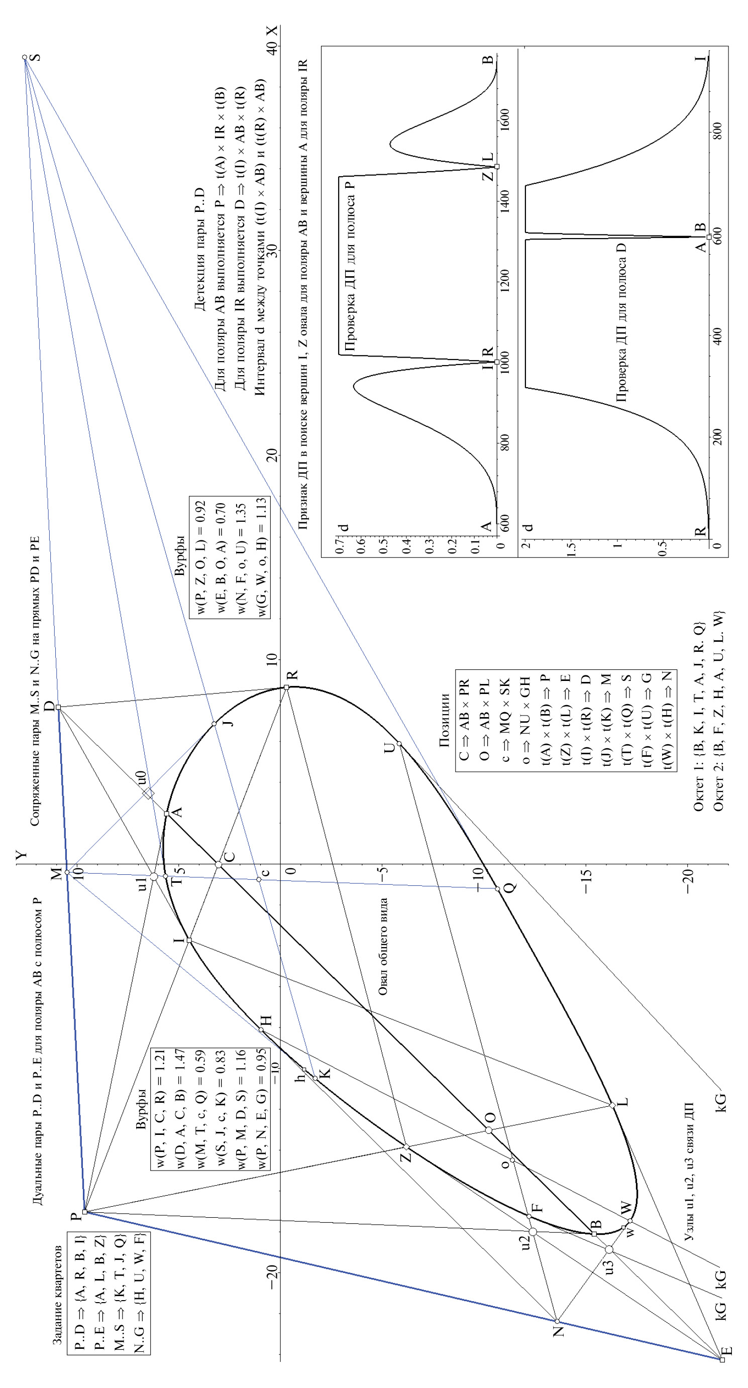 Поиск ДП для P дал триаду, описанную в разд. 2 (см. рис. 5): найдены позиции D и d по обе стороны от хорды = поляры AB, что и создало повод вычислить не только все требуемые оценки для полюса P (в качестве первичной позиции), но и дополнить их аналогичным инвариантным описанием теперь уже для вторичного полюса D, что и предъявлено на четырех врезках рис. 20 (для P справа, для D – слева).