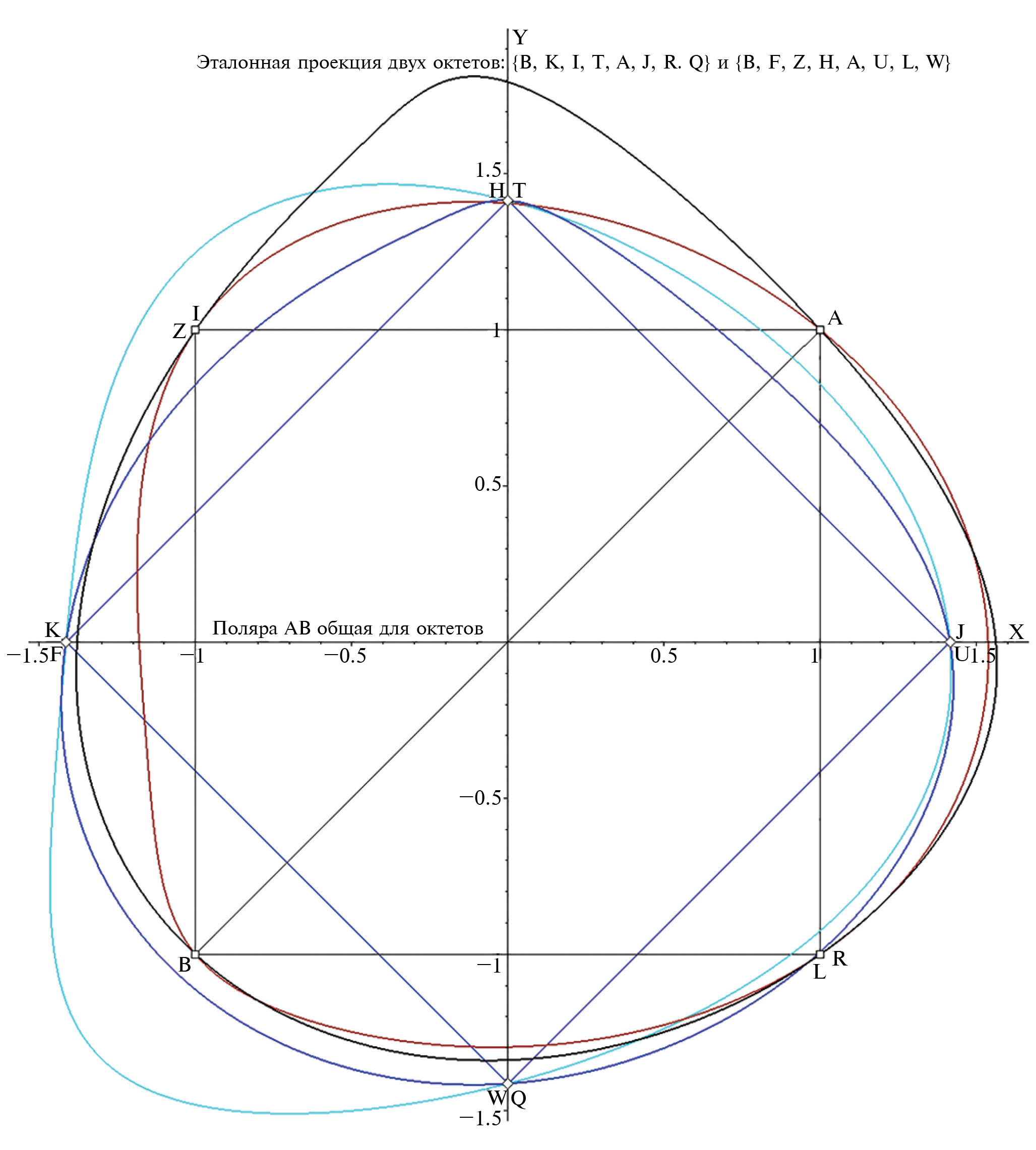 Ставший стандартным поиск ДП на ext-L, дал четыре новых точки: на PD найдена ДП M..S, на PE локализована N..G. Получившаяся картина с пятью внешними полюсами дает материал для локализации на контуре о 14 стабильных позиций (4 × 4 – 2). Этот ансамбль можно использовать двояко: либо сформировать замкнутую ломаную дескриптора в виде графа с 14 вершинами (ничуть не хуже – вычислить два восьмивершинных графа для каждого октета), либо построить два восьмиточечных проекционных эталона для сетов {B, K, I, T, A, J, R, Q} и {B, F, Z, H, A, U, L, F} (рис. 6).