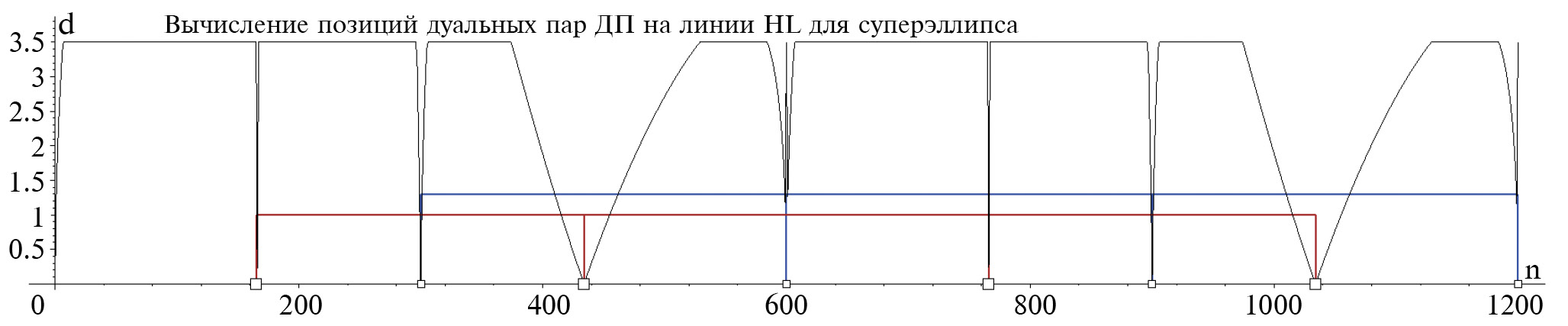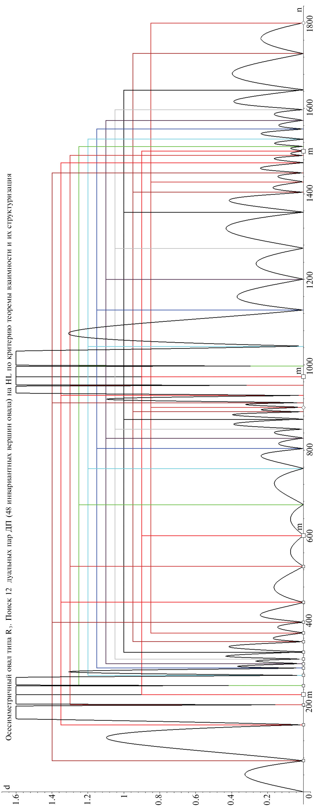 Когда на HL лишь две ДП, эти четыре позиции без труда можно было найти подбором вручную, но для получения репрезентативной статистики на большом массиве модельных тестов процедуру поиска следовало сделать автоматической (а еще и быстрой, и точной). А когда таких ДП много (как, например, для овала типа R3 с симметриями, что описано в разд. 6, 7), необходимо автоматизировать и кластеризацию полученных квартетов номеров для контура о, представляющих каждую ДП на HL.