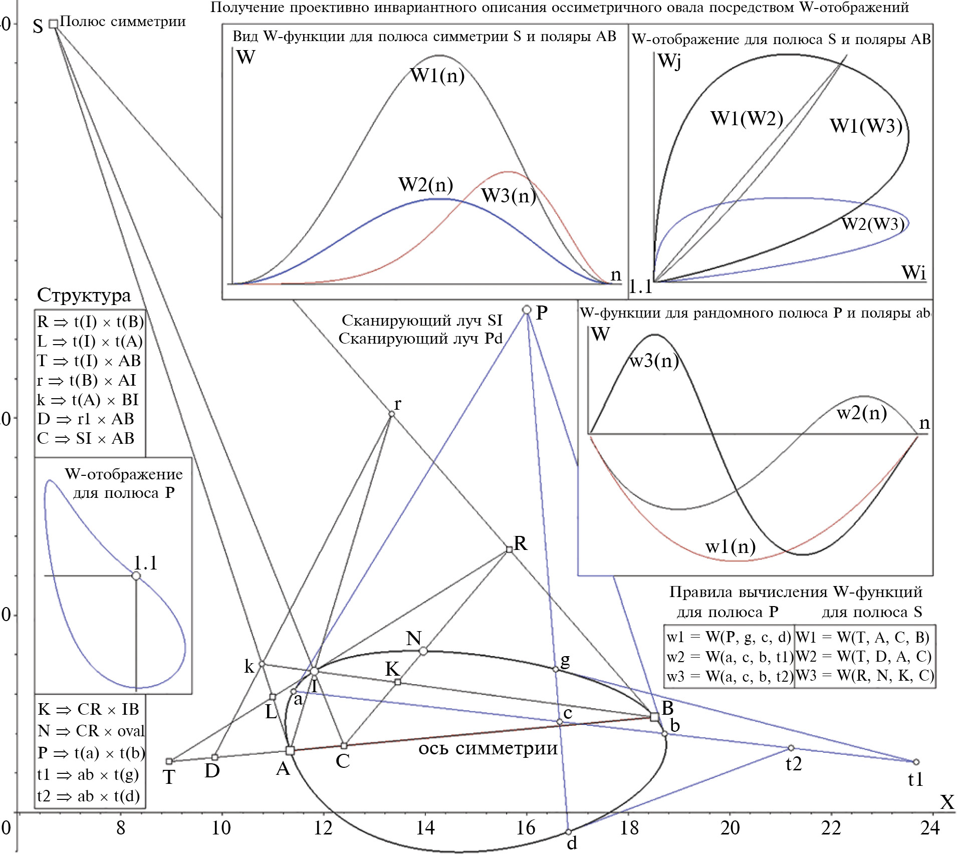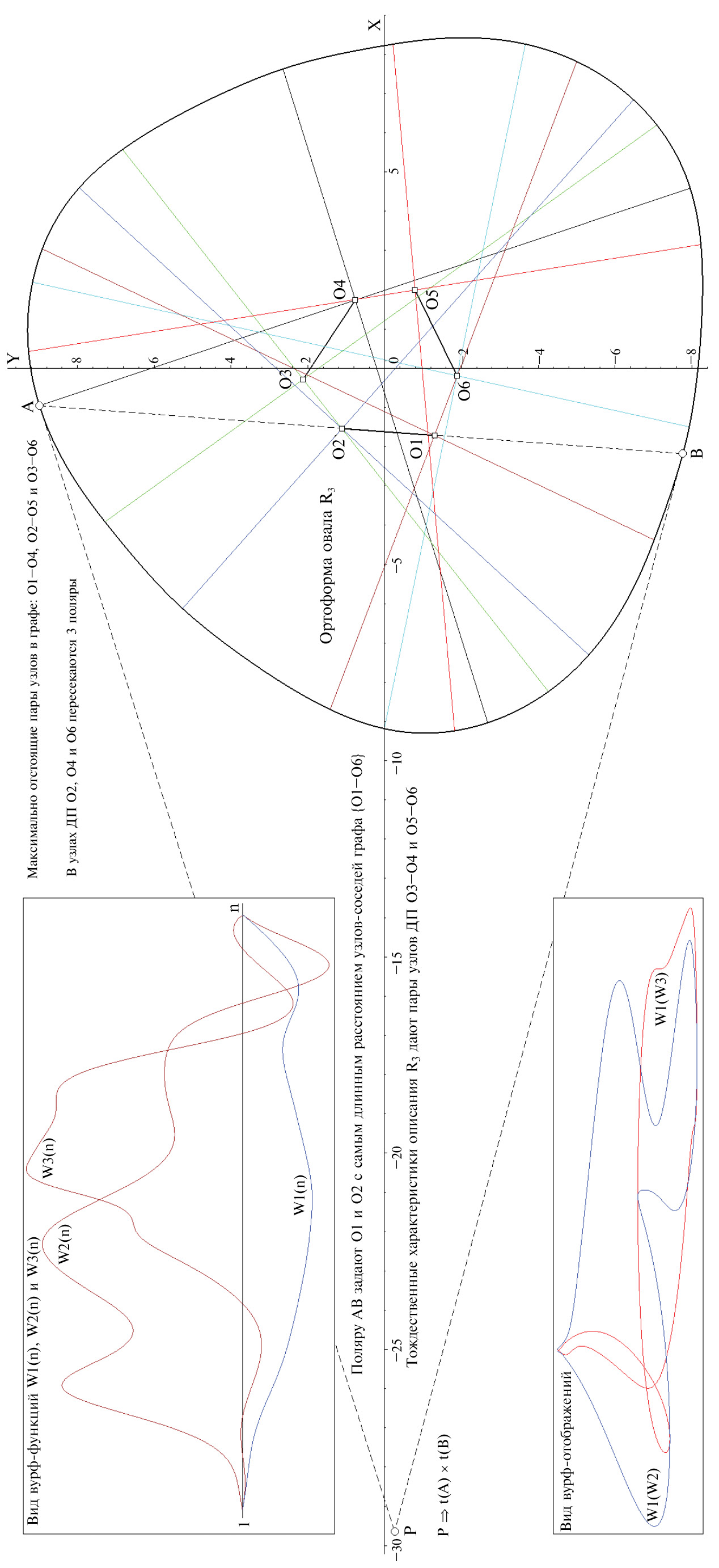 Рис. 17. Картина попарной регулярной организации узлов ДП у ортоформы о типа R3, не имеющего трех скрытых осей симметрии, для которого в качестве плюккеровой поляры выбрана хорда AB, инцидентная узлам O1 и O2, относительно полюса P которой и вычислены необходимые W-функции и пара W-отображений (их вид показан на врезках слева), а уникальность выбора P основывается на тождественности вурф-продуктов, получаемых для поляр с парами узлов O3–O4 и O5–O6. Остальные пояснения в тексте