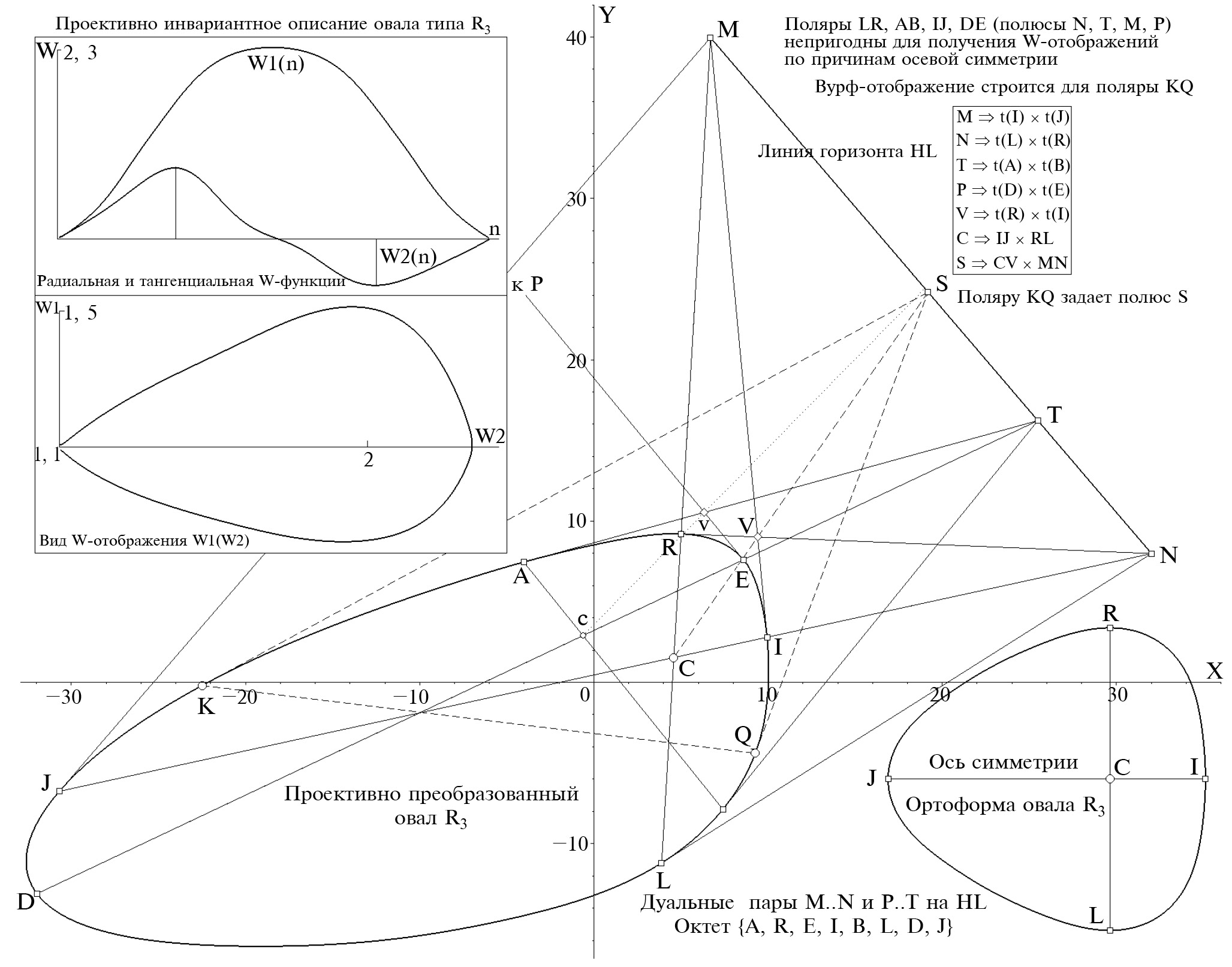 На врезках рис. 17 показаны: триада W-функций (вверху: схема радиальной и двух тангенциальных) и двух W-отображений (ниже: W1(W2) и W1(W3)). По причинам той же периодичности свойств карты узлов на рис. 17 зафиксирована (текстом и графически – на сетке поляр для ортоформы) особенность: в узлах ДП O2, O4, O6 пересекаются три плюккеровых поляры, фиксируемых по итогам вычислительного поиска ДП.