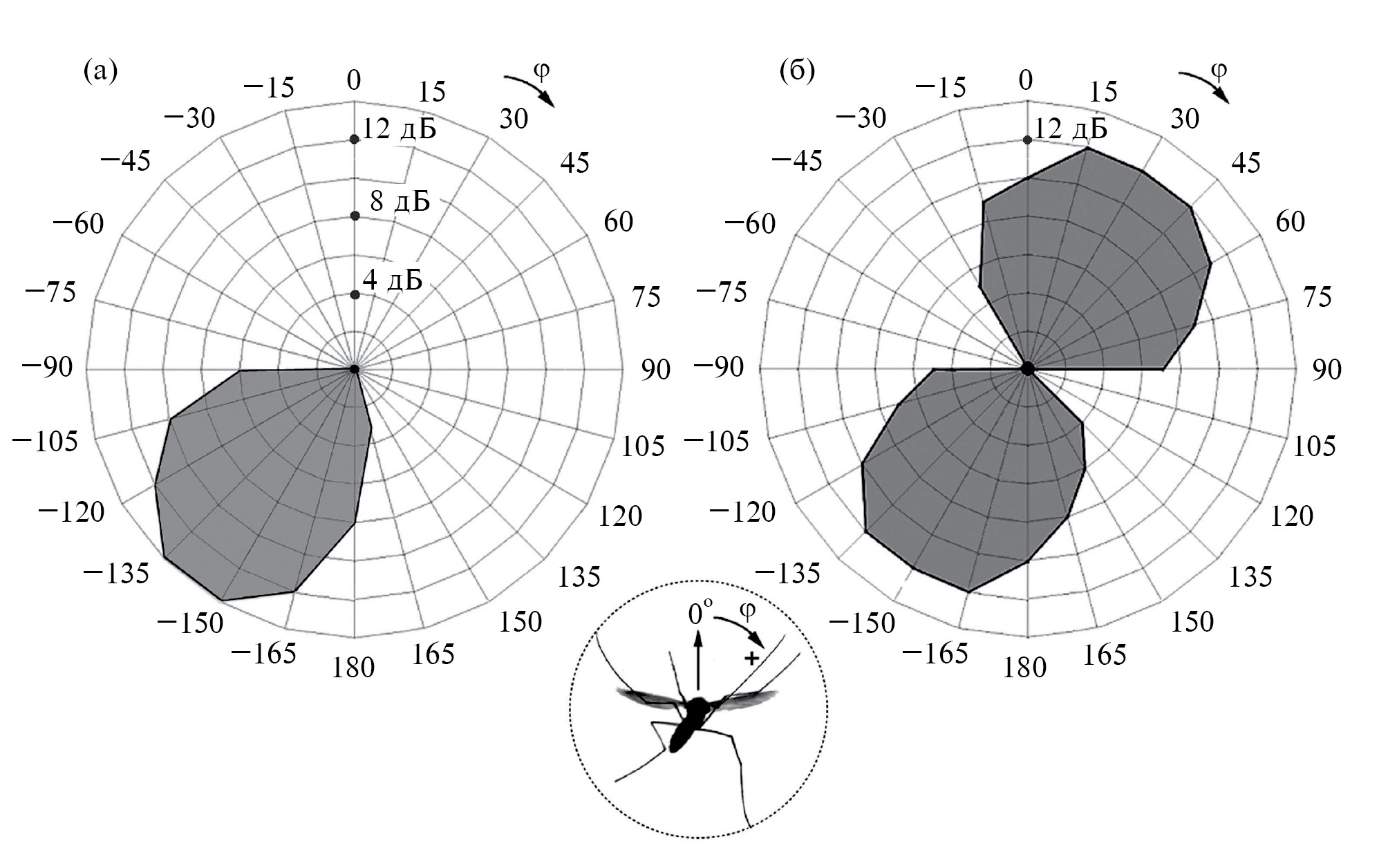 Рис. 7. Диаграммы направленности слуховых рецепторов левого ДО cамок Culex pipiens pipiens, измеренные в процессе стимуляции в контуре обратной связи: а – диаграмма направленности одиночного рецептора, состоящая из одного униполярного лепестка (частота автовозбуждения 112 Гц); б – диаграммы двух рецепторов (частоты настройки 104 Гц и 77 Гц), активность которых одновременно была зарегистрирована в одной и той же области антеннального нерва. Рецепторы в этой паре реагировали в противофазе на акустическую стимуляцию, в режиме автовозбуждения их диаграммы направлены в противоположные стороны. На врезке с изображением комара (вид сзади) показано нулевое положение и направление положительного отсчета угловой координаты j. По радиусу диаграмм отложена относительная чувствительность (величина, обратная порогу автовозбуждения). Рисунок по (Lapshin, Vorontsov, 2023) с изменениями