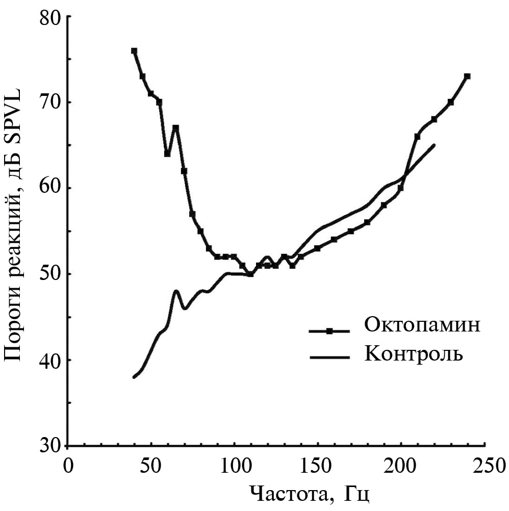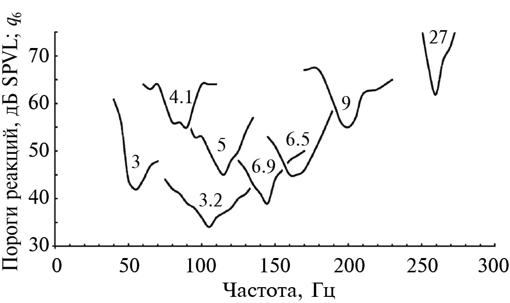 По-видимому, вследствие особенностей действия адаптационных механизмов в слуховой системе комаров при измерении порогов наблюдается гистерезис: порог, измеренный при постепенном повышении уровня стимула, как правило, выше порога, измеренного при уменьшении уровня до подпороговых значений. С учетом этого обстоятельства измерения порогов надо проводить однотипно, например при постепенном увеличении уровня стимуляции от подпороговых значений (Lapshin, Vorontsov, 2013).