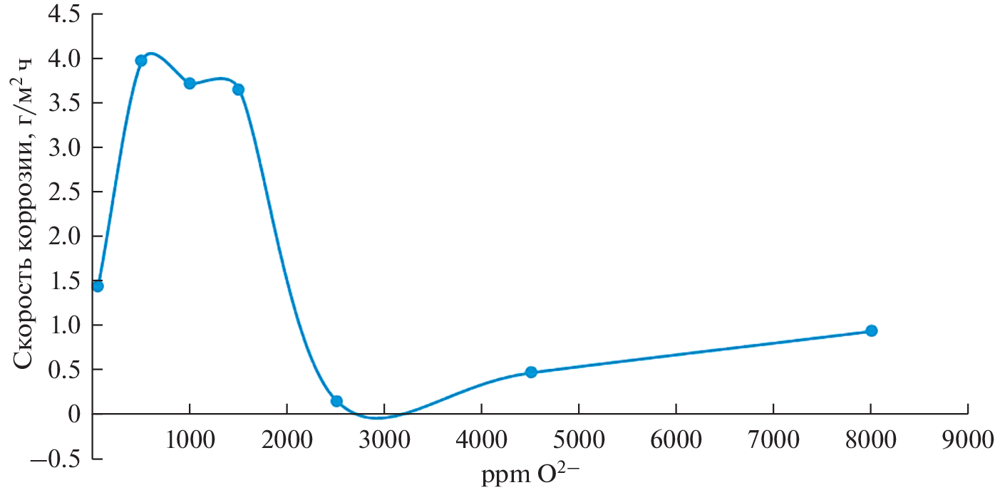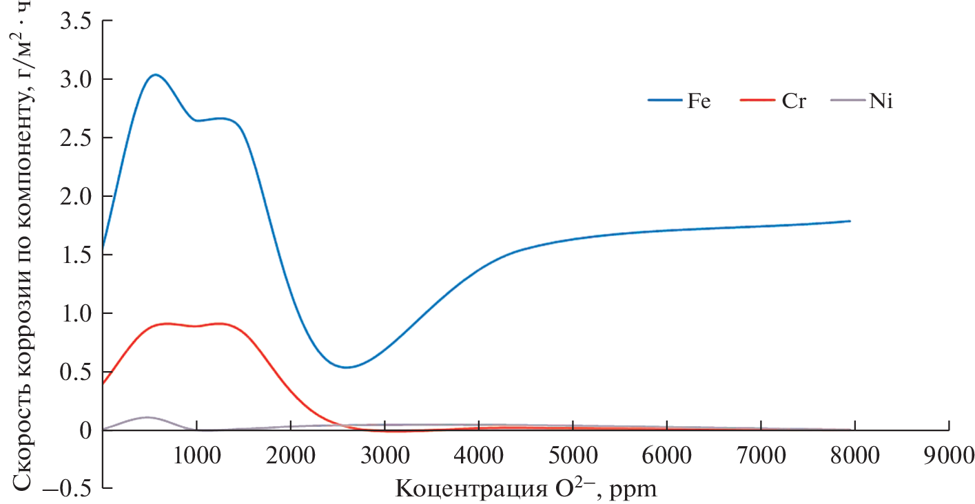Были проведены эксперименты по определению скорости коррозии нержавеющей стали AISI 316 во фторидных расплавах с различной концентрацией O2– (путем добавления в расплав оксида лития в диапазоне концентраций от 0 до 5 мас. %). В результате серии экспериментов установлено, что происходит снижение скорости коррозии на порядок при концентрации анионов кислорода в расплаве от 0.2 до 0.4 мас. %, что может свидетельствовать об обнаружении явления высокотемпературной пассивации материала за счет модифицирования состава фторидного расплава и снижения его коррозионной активности. Кроме того, типичный для нержавеющих сталей тип межкристаллитной и питтинговой коррозии во фторидных расплавах, наиболее опасной с точки зрения конструкционного реакторного материала, при добавлении оксида лития изменяется на сплошной за счет “залечивания” отдельных коррозионных очагов избыточными кислородсодержащими соединениями. Установлено образование защитного слоя шпинельного типа толщиной 1 мкм.
